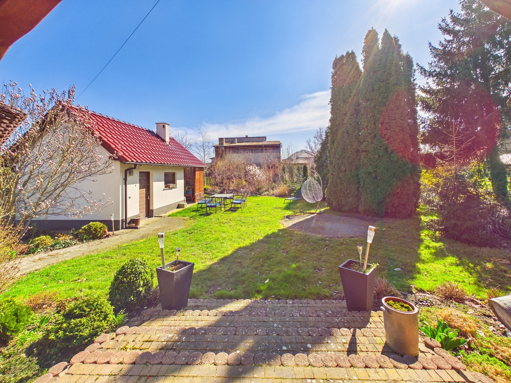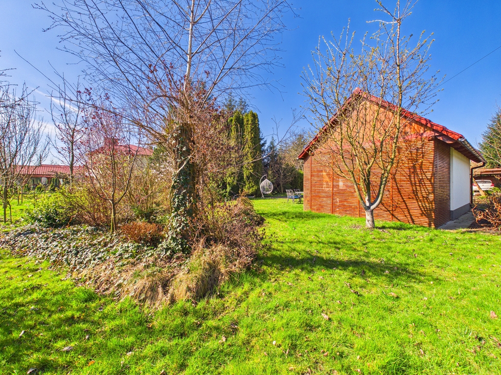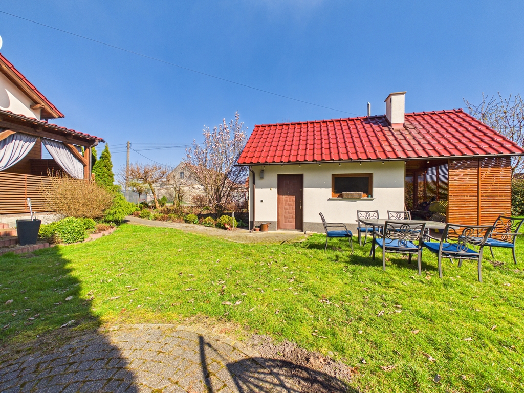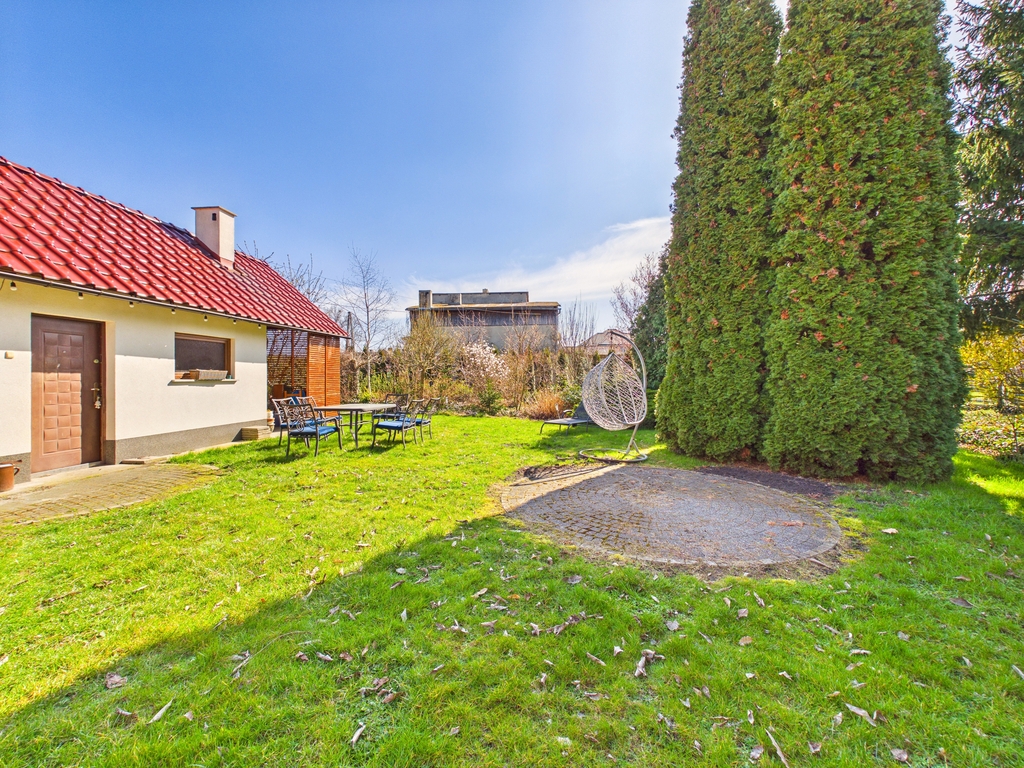 12,26 ar. Nieruchomość zadbana, z funkcjonalnym układem pomieszczeń, idealna dla rodziny. Dużym atutem jest przestronny ogród z licznymi nasadzeniami.