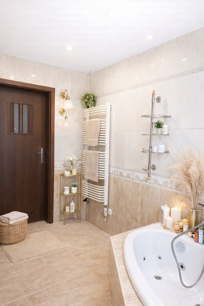 Łazienka została wyposażona zarówno w narożną wannę, jak i prysznic – wygodne rozwiązanie dla           całej rodziny.