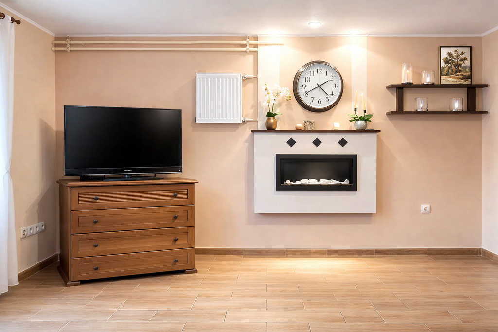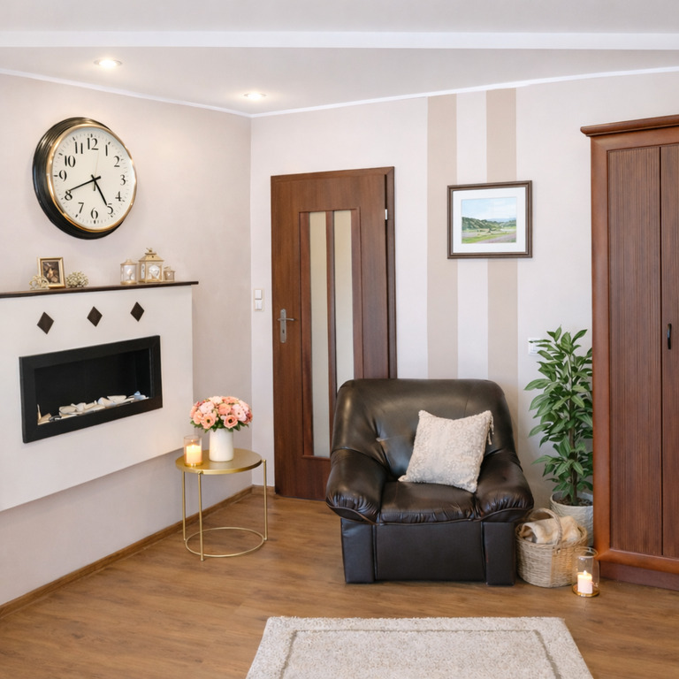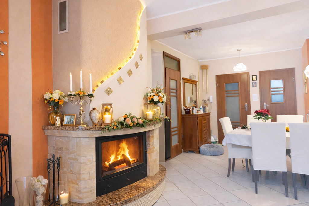 Kominek dodatkowo podkreśla ciepły, rodzinny klimat wnętrza.