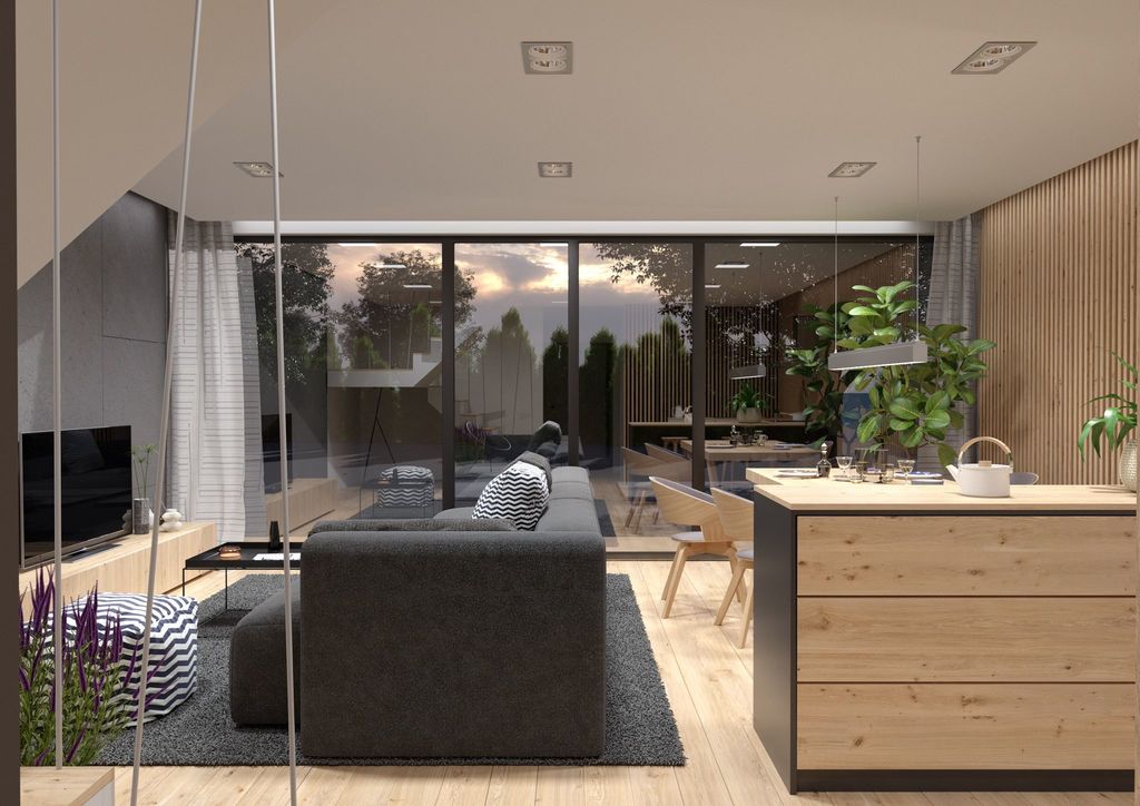 Dom zaprojektowany został w stylu skandynawskim. Cechuje go przede wszystkim otwarta przestrzeń i sporo przeszkleń co czyni go atrakcyjnym.