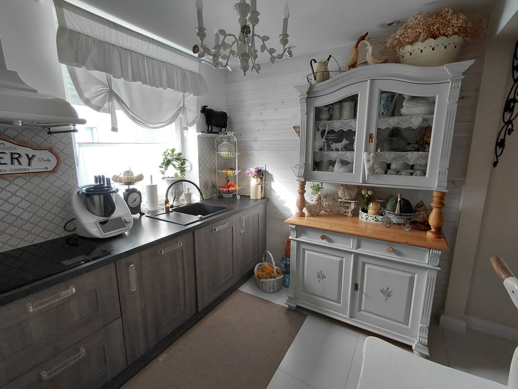 Pomieszczenia w domu doskonale doświetlone, ustawne. Obie kuchnie wyposażone w meble kuchenne i sprzęt AGD w zabudowie.