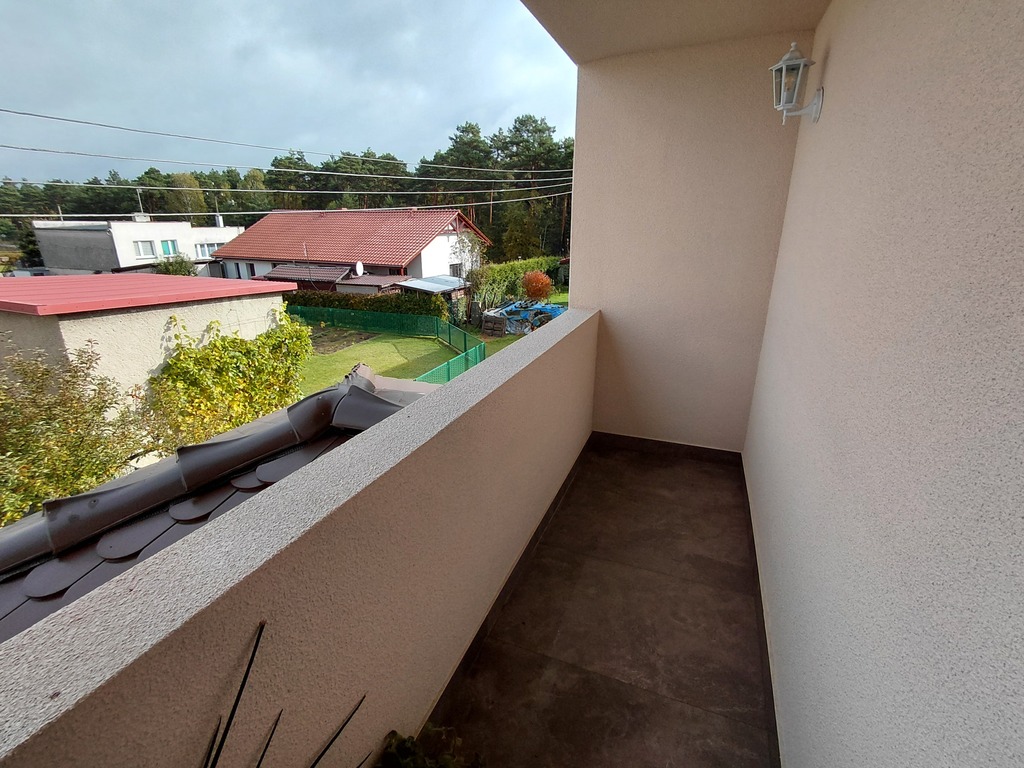 - Na piętrze znajdują się trzy pokoje, duża łazienka z wanną i korytarz, z którego prowadzi wyjście na balkon usytuowany od strony ogrodu.