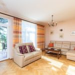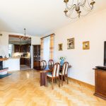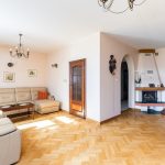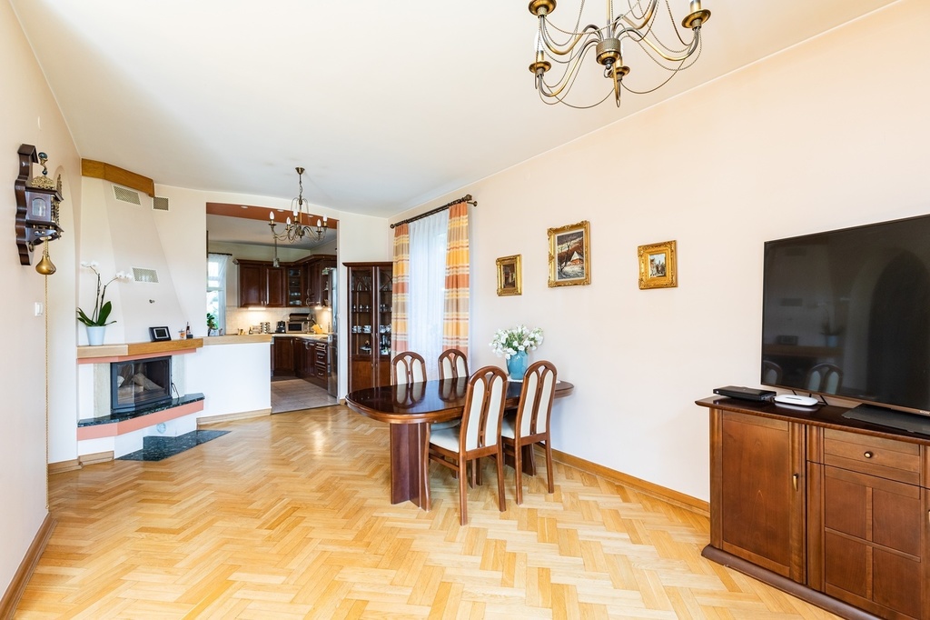 - salon o pow. 47,1 m2; przestrzenny i bardzo dobrze doświetlony, z dwoma podwójnymi parami drzwi prowadzącymi na taras i ogród; z narożnym kominkiem opalanym drewnem; w salonie duży stół (po rozłożeniu 4,5 m długości, nawet dla 18 osób) oraz komplet skórzany sofa i narożnik marki Kler (wymienione ok. 4 lata temu). Na podłodze parkiet dębowy.