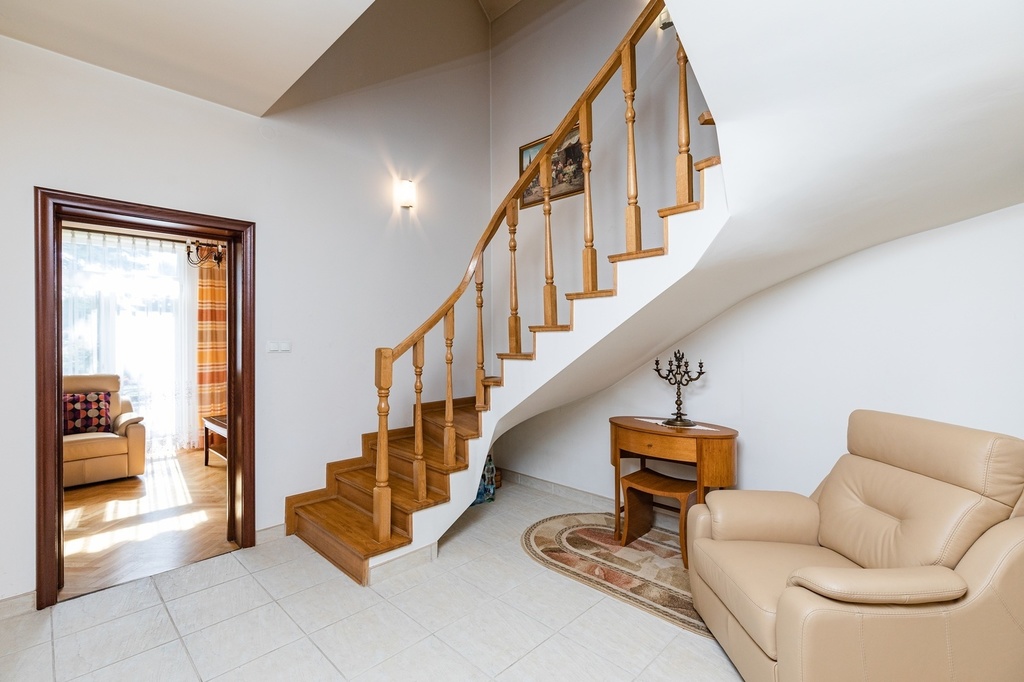 - hall z klatką schodową, na podłodze gres, schody dębowe.