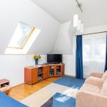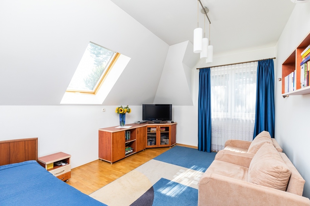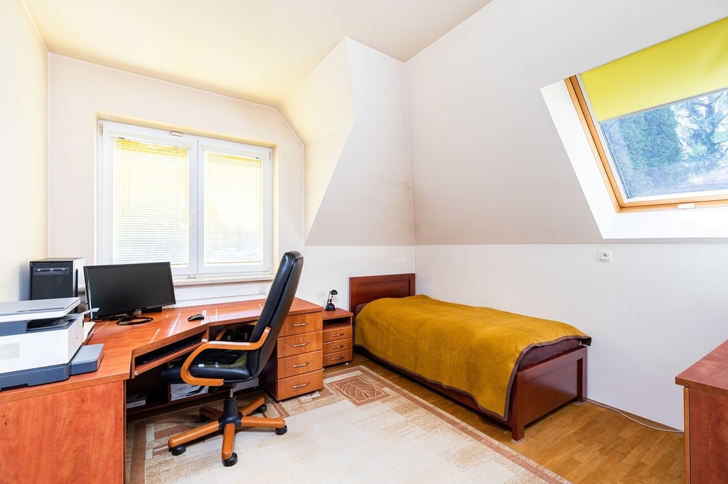 - sypialnia o pow. 11,9 m2, ekspozycja wschodnia, z dużym oknem dachowym z roletą, podłoga dębowa, klimatyzacja, duże narożne biurko robione na zamówienie.