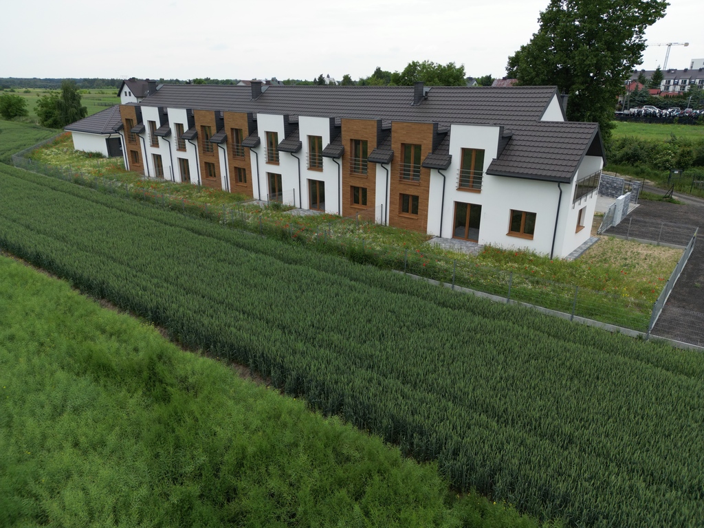 Domy w zabudowie szeregowej mają wykonaną elewację zewnętrzną z elementami dekoracyjnymi. Przed wejściem do segmentów zostaną wykonane drewniane pergole. Doda to atrakcyjności wizualnej budynkowi.
