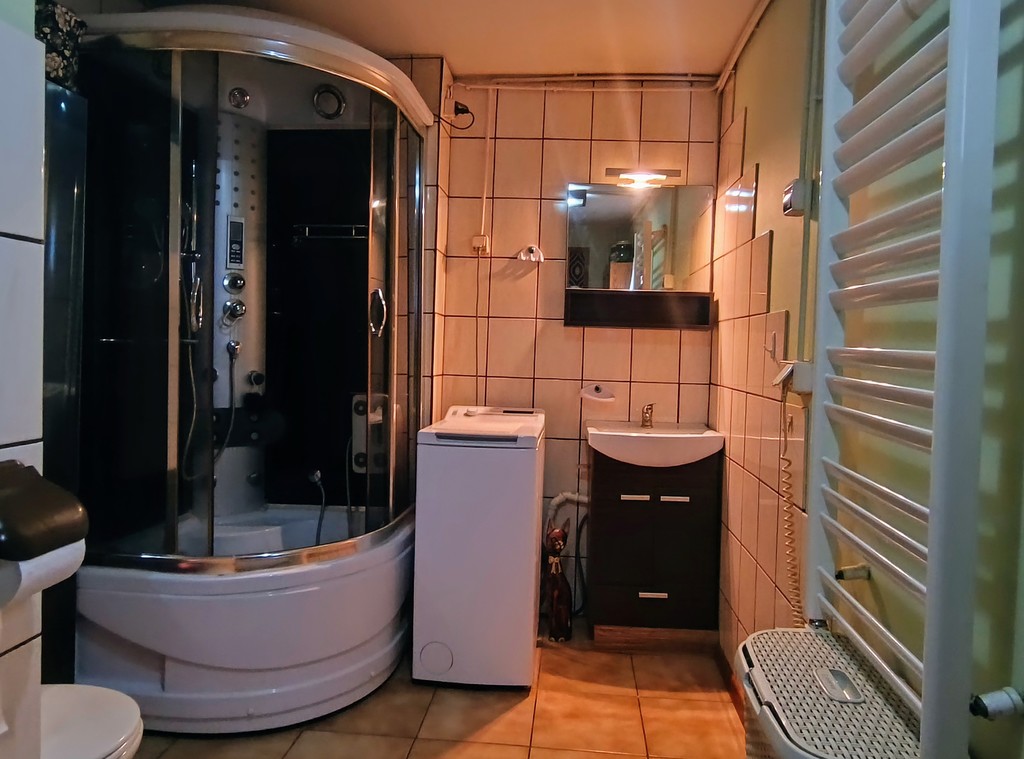 W łazience znajdziesz kabinę prysznicową, a podpiwniczenie pod łazienką zapewnia dodatkowe miejsce do przechowywania.