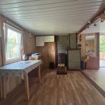 salon z kominkiem z częścią kuchenną, w której możesz urządzić aneks wg własnego uznania oraz wyjście na