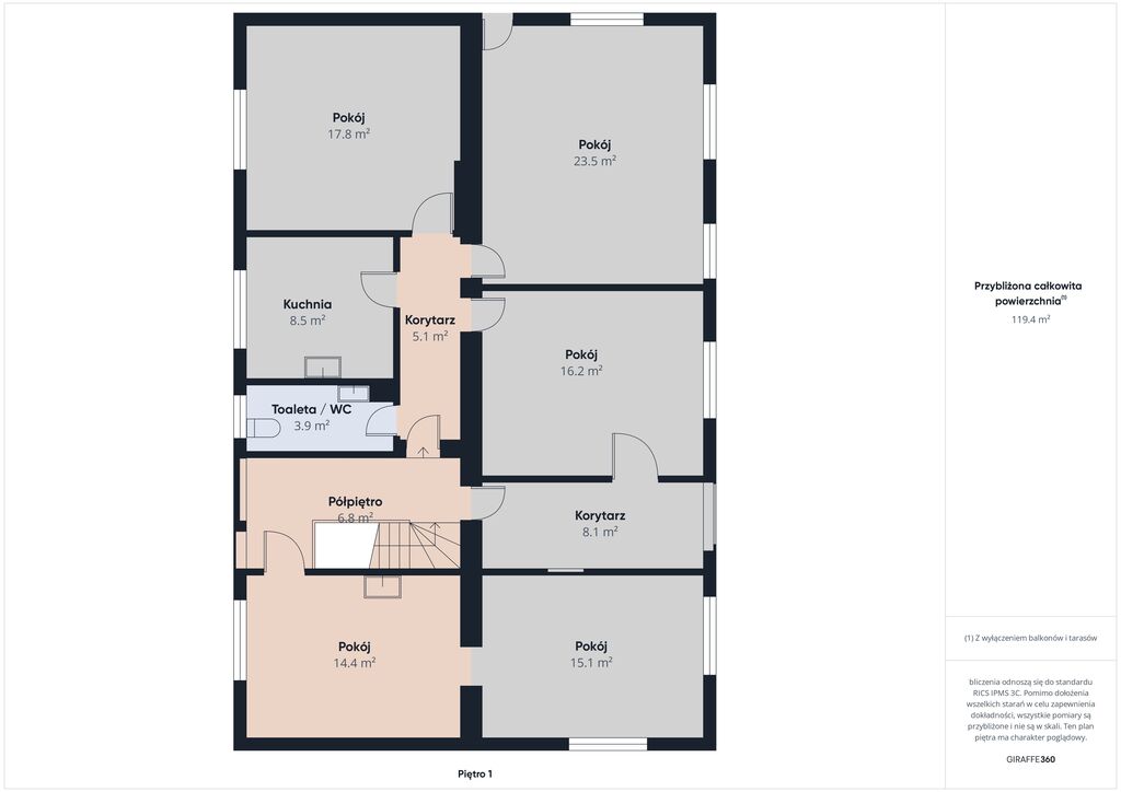 - Półpiętro: 6,8 m² – dodatkowa przestrzeń komunikacyjna, np. na półpiętrze klatki schodowej.