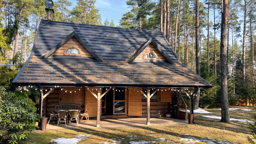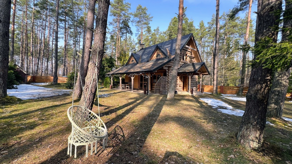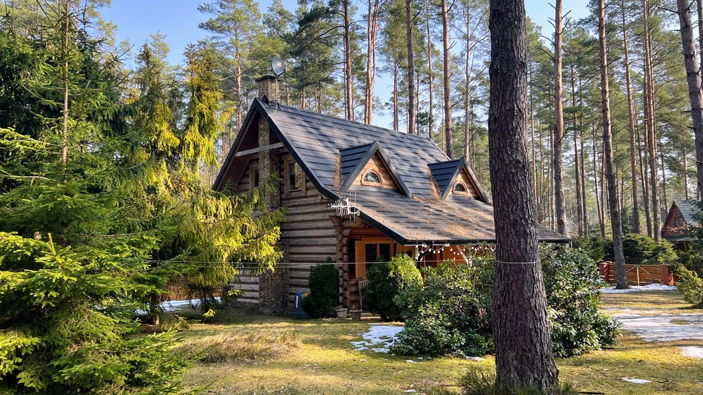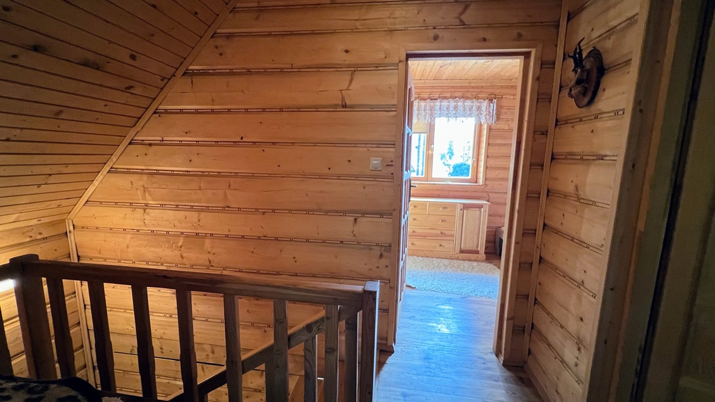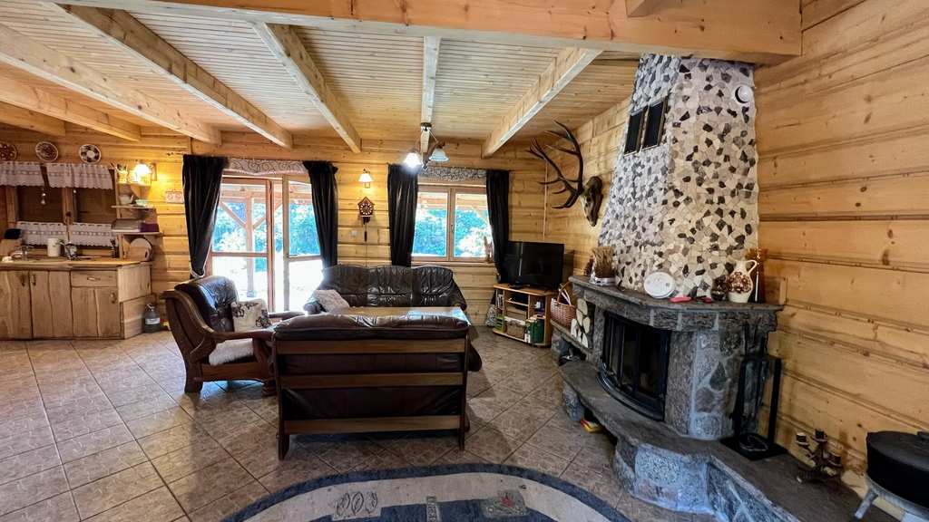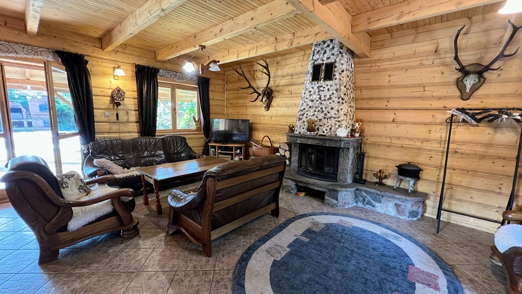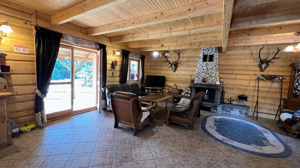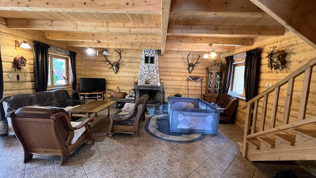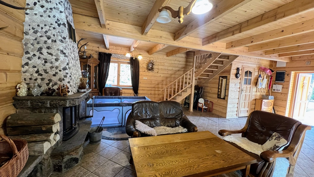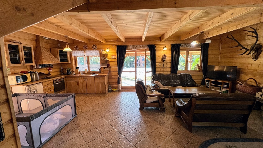letniskowy dom z bala nawiązujące do góralskiego stylu, robiący klimat – idealny na wakacje, wynajem lub jako własna baza wypadowa przez cały rok. Nieruchomość znajduje się w spokojnej okolicy, zaledwie