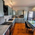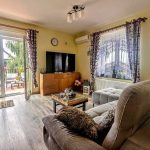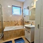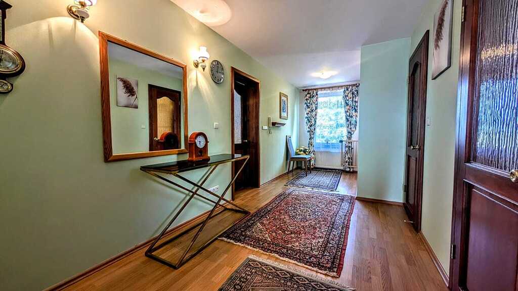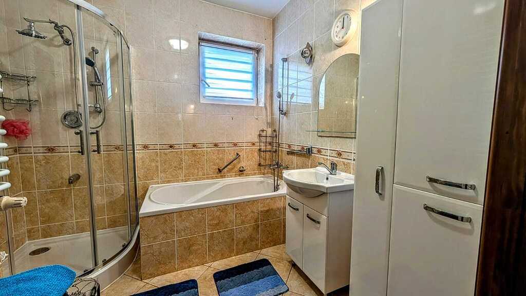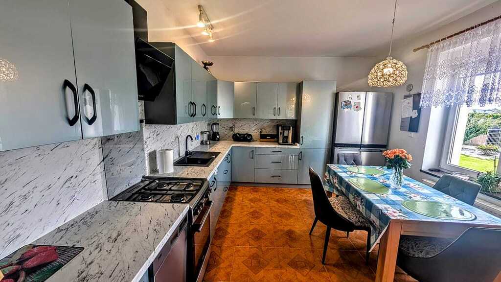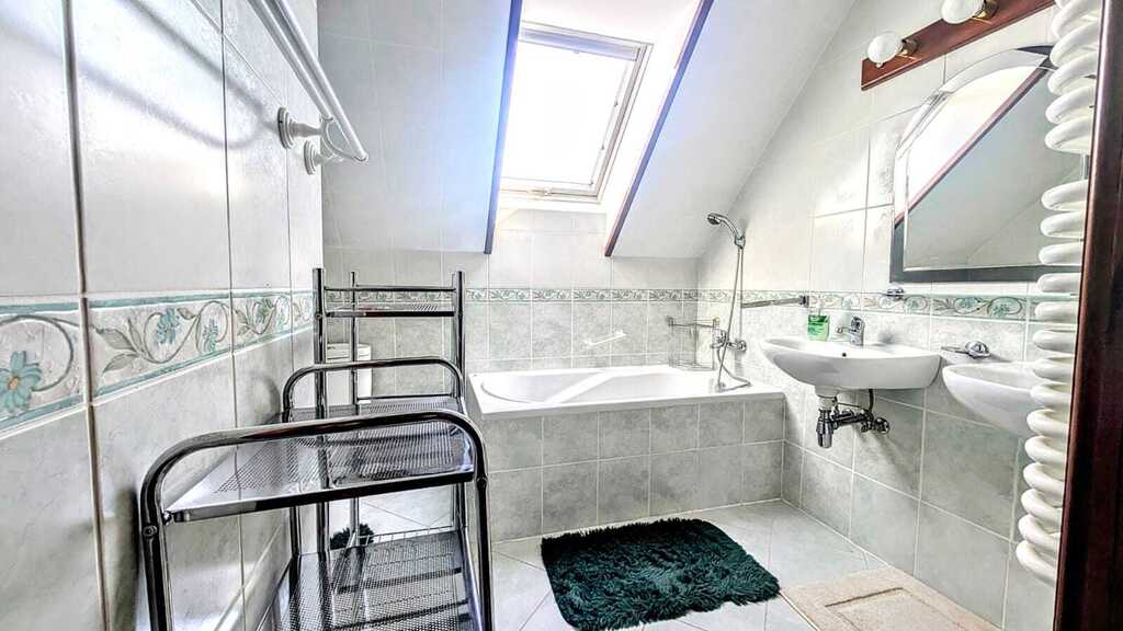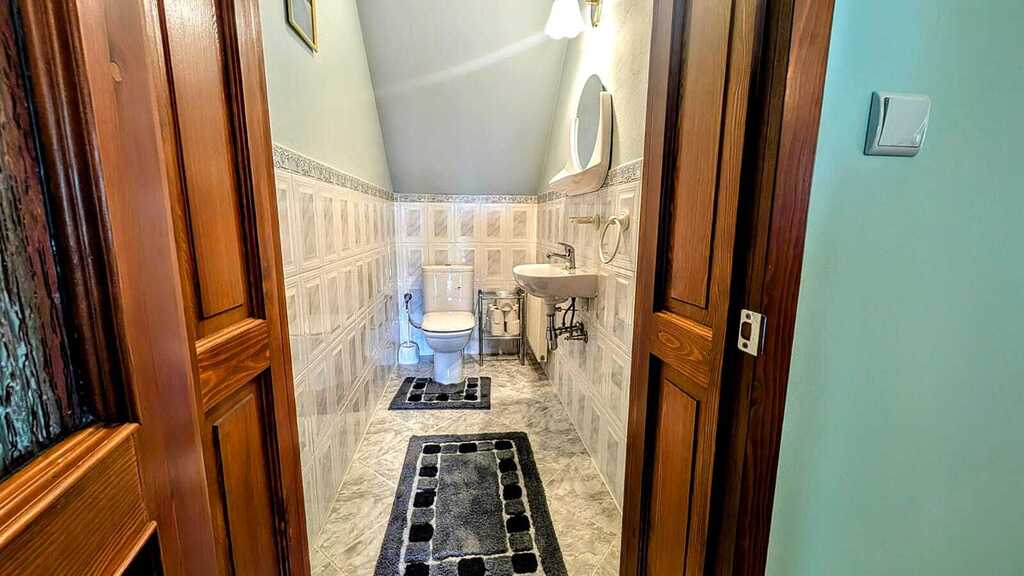 - Wyposażenie: kuchnia w pełni umeblowana, wyposażona w nowoczesny sprzęt AGD, łazienka na parterze z umywalką, prysznicem oraz wanną, łazienka na piętrze z wanną, toaletą oraz dwoma umywalkami, dodatkowo osobne dwie toalety