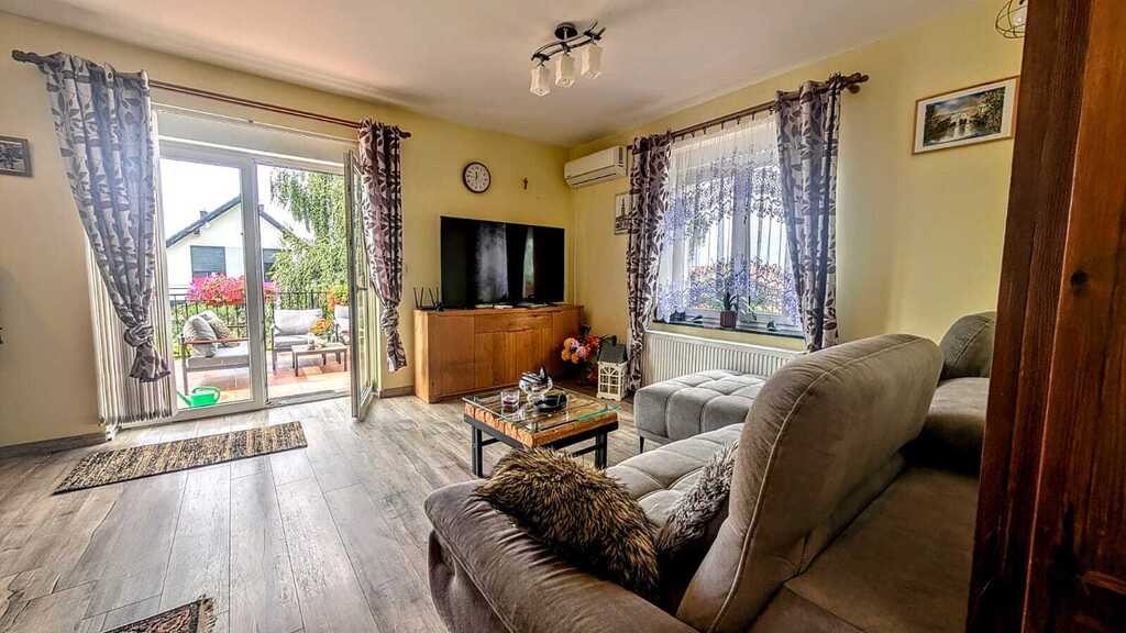 - Funkcjonalny rozkład: duży, jasny salon z wyjściem na taras, przestronne sypialnie oraz wygodna kuchnia