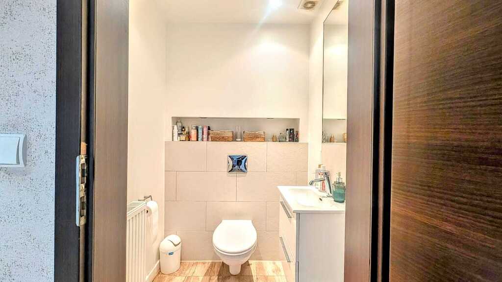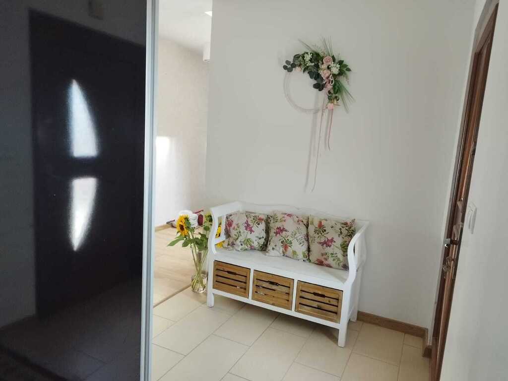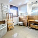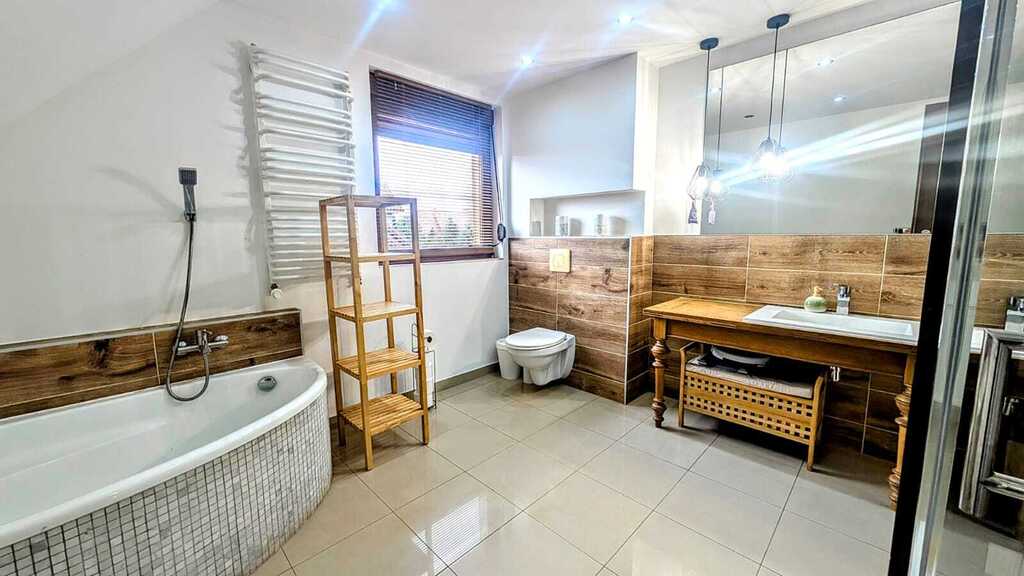 - Wyposażenie: kuchnia w pełni umeblowana, wyposażona w nowoczesny sprzęt AGD, toaleta na parterze z umywalką, łazienka na piętrze z wanną, prysznicem, toaletą oraz umywalką