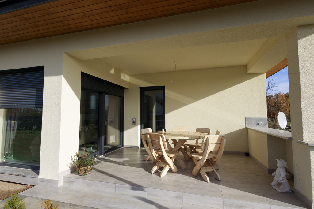 - taras z wyjściem na ogród to idealnie miejsce do relaksu na świeżym powietrzu.
