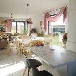 - przestronny salon połączony z jadalnią, znajduje się obok kuchni, posiada również piękne, duże przeszklenia prowadzące na taras