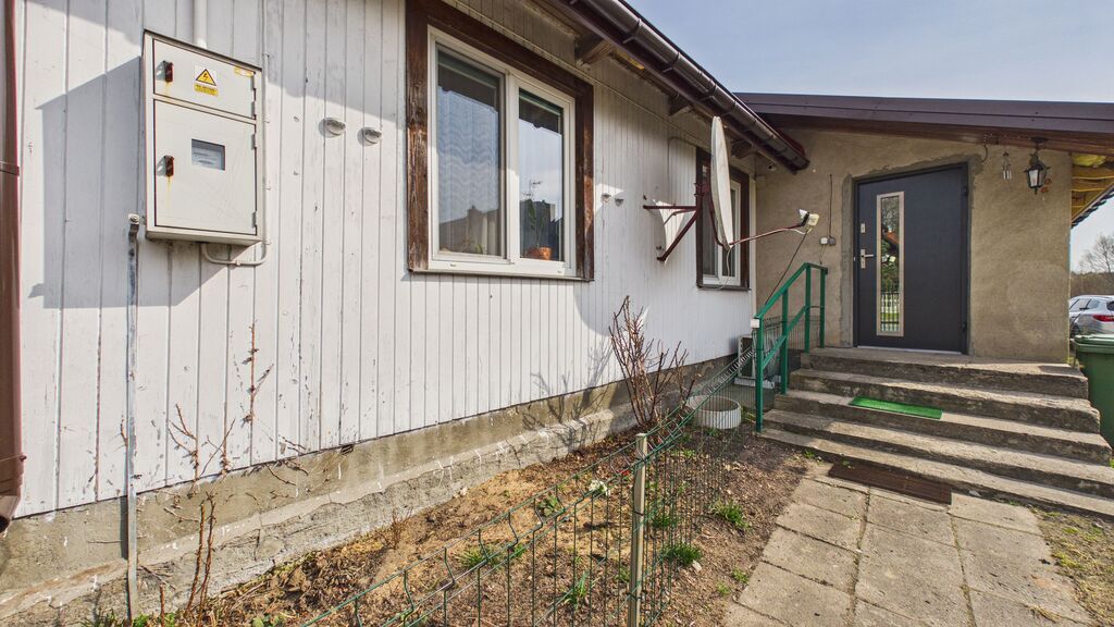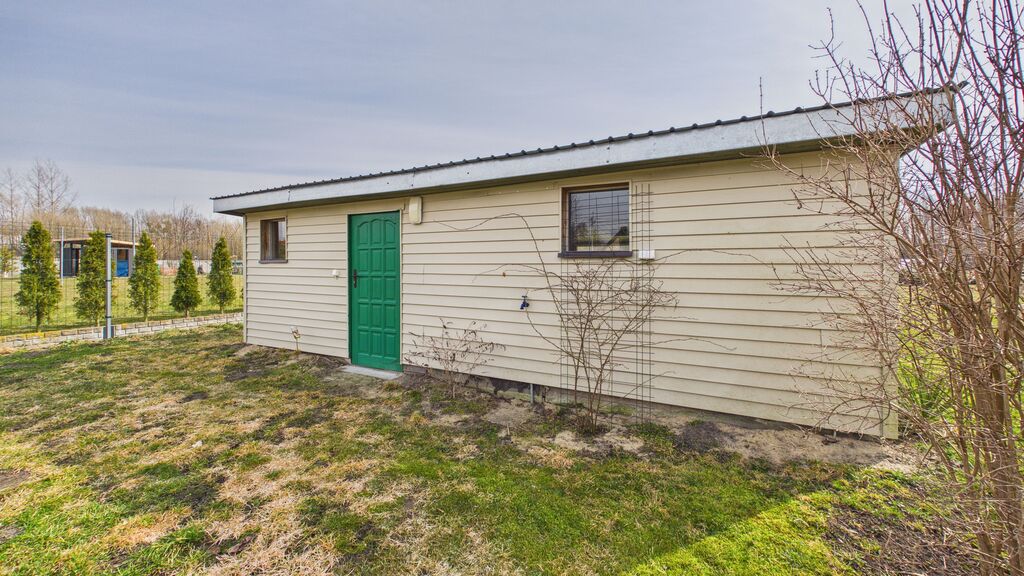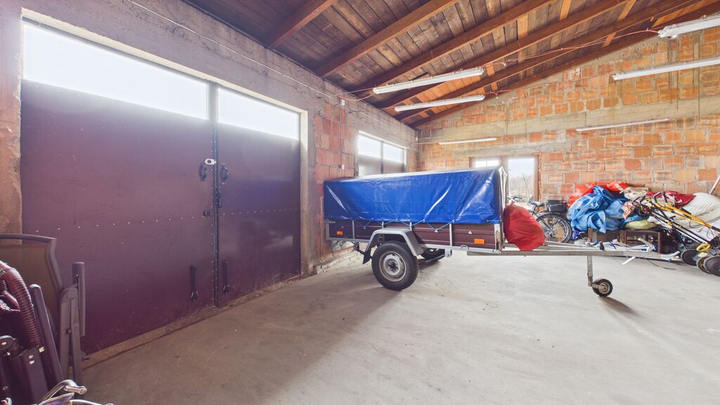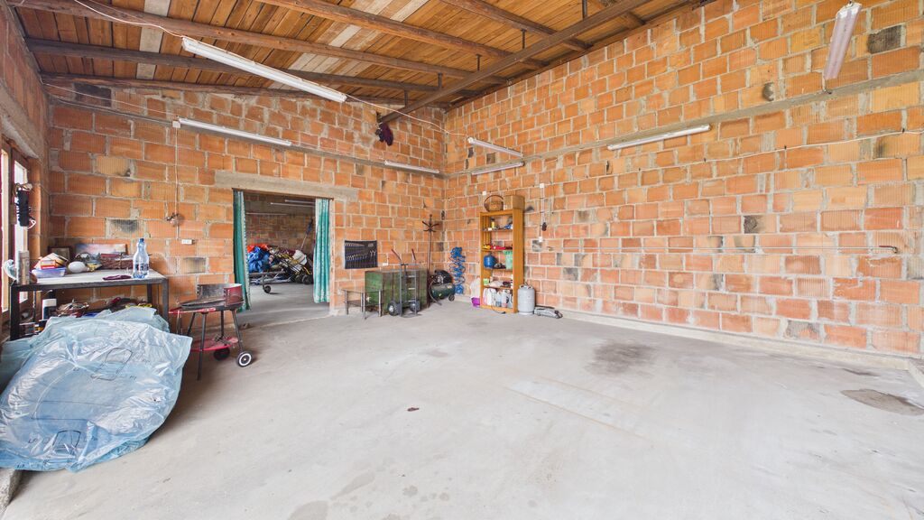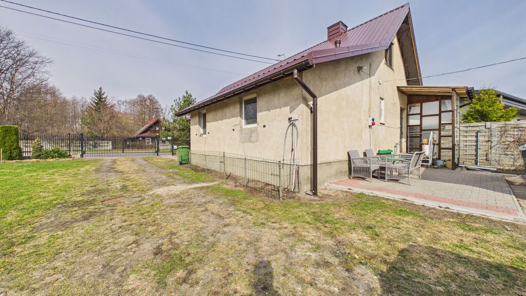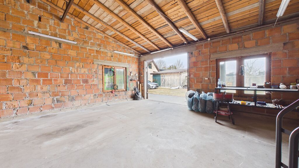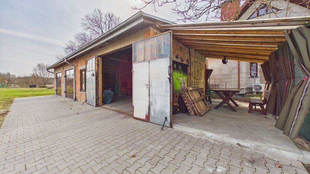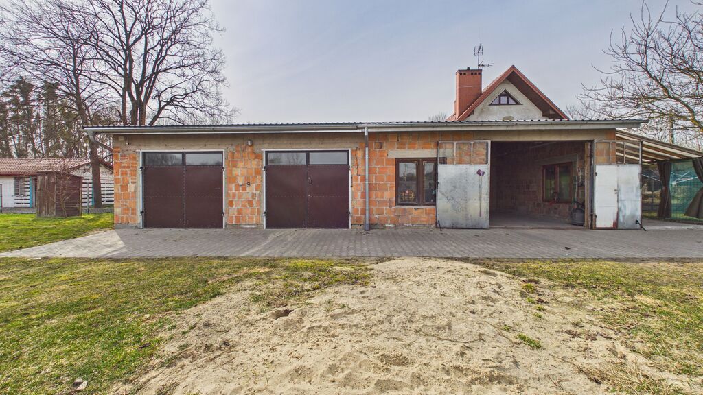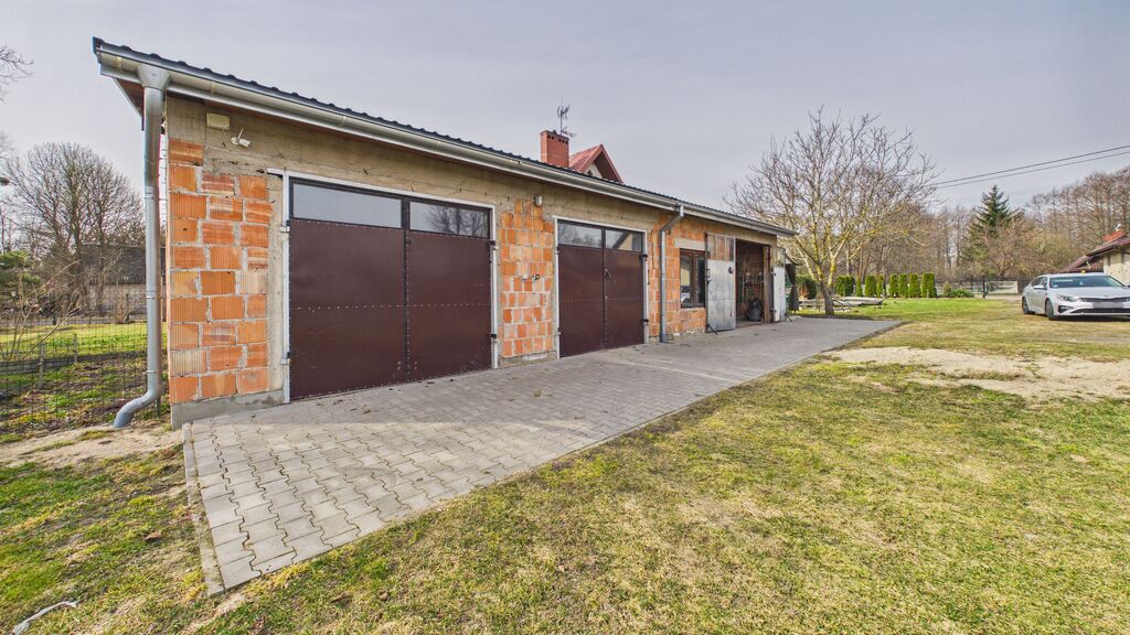 duża działka, garaż ok. 90 m² (3 stanowiska / warsztat) oraz dodatkowy budynek – letnia kuchnia.