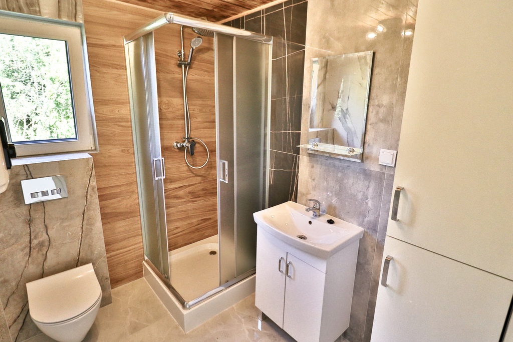 - łazienka która została starannie wykończona.