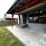- wykostkowany teren z częścią nasadzonej trawy i miejscem na grilla