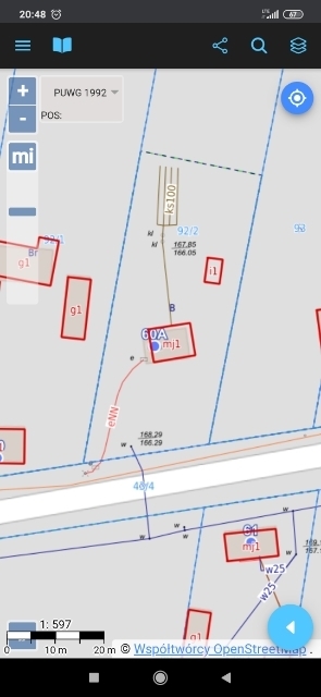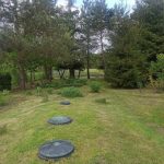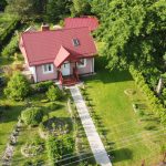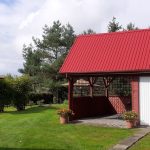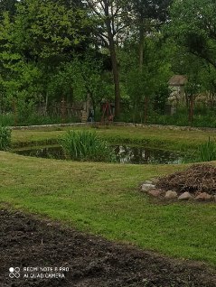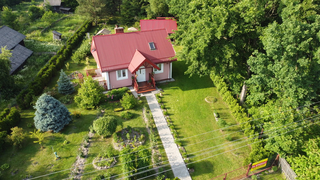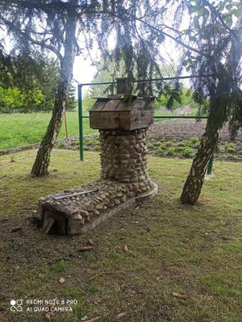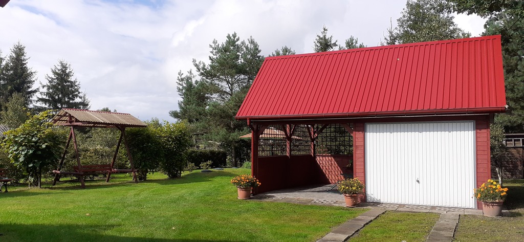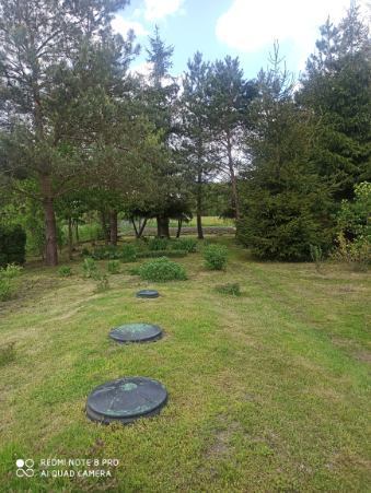 Działka o powierzchni 2300 m2 z licznymi nasadzeniami ,ogrodzona w kształcie prostokąt, długość 100 m, szerokość 23 m. Na terenie działki znajduje się drewniany garaż z wiatą gospodarczą o powierzchni 30 m2 (rok budowy 2017 r.), wędzarnia, oczko wodne, zabudowania gospodarcze.