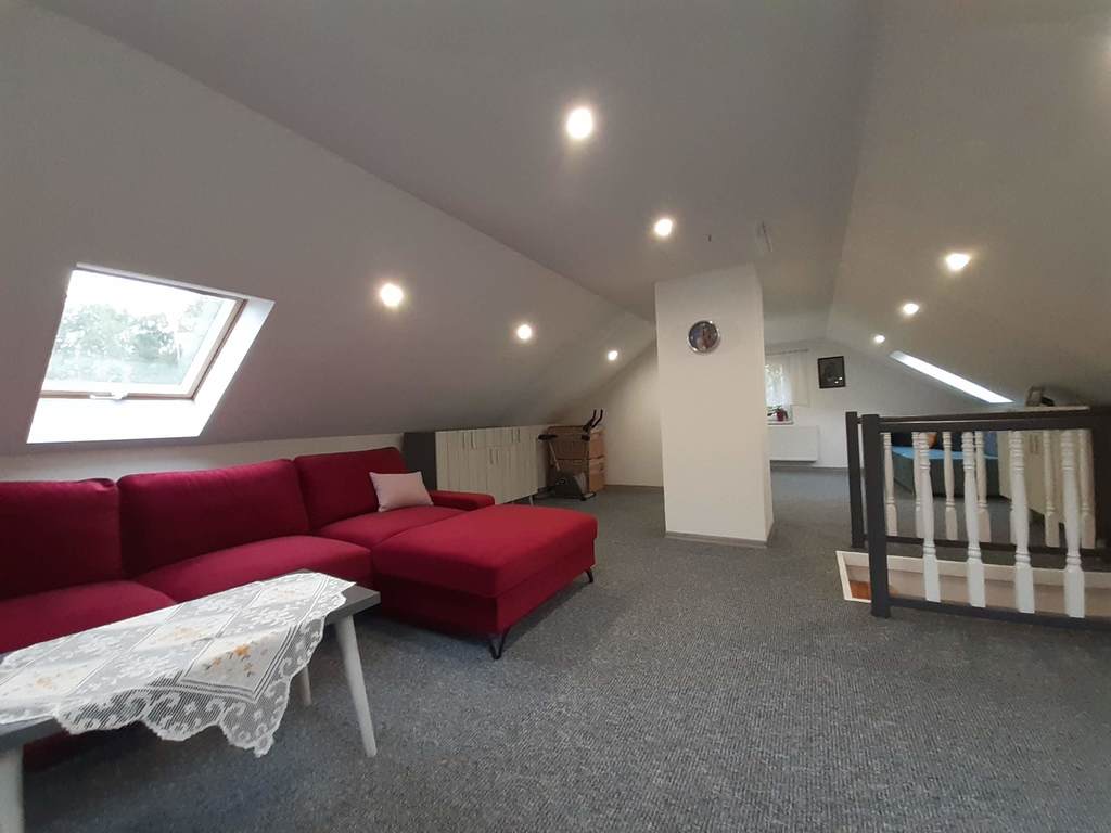Składa się z 3 pokojów, w tym dużego salonu połączonego z kuchnią, korytarza, łazienki oraz toalety na poddaszu. Powierzchnia parteru ok. 70 m2, poddasza 50 m2.