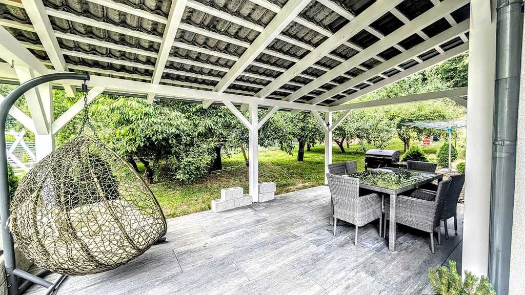 - Teren: ogrodzony, ogród z różnymi nasadzeniami oraz miejscem do relaksu
