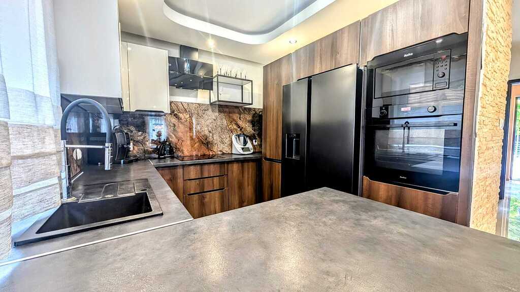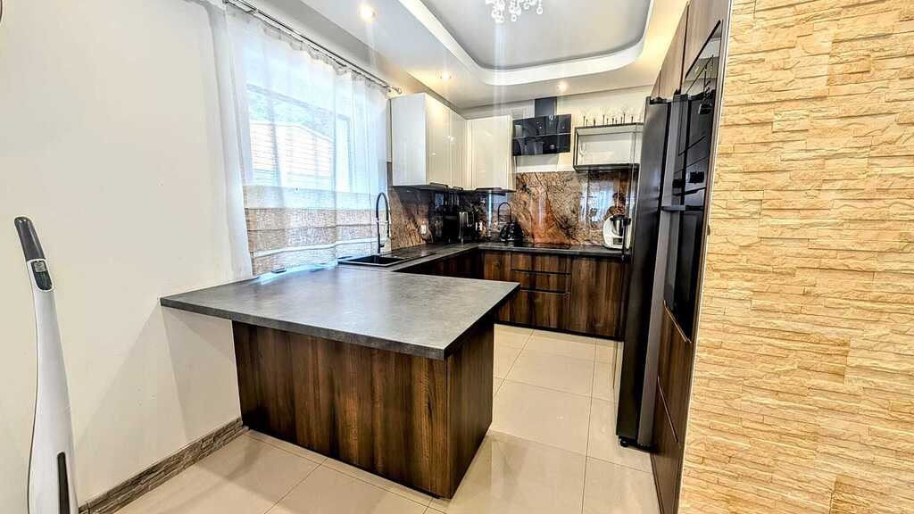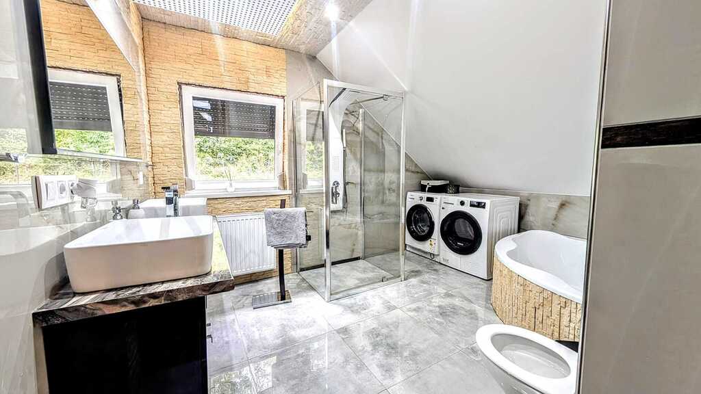 - Wyposażenie: kuchnia w pełni umeblowana, wyposażona w nowoczesny sprzęt AGD, łazienka z prysznicem na parterze, łazienka z wanną i prysznicem na piętrze