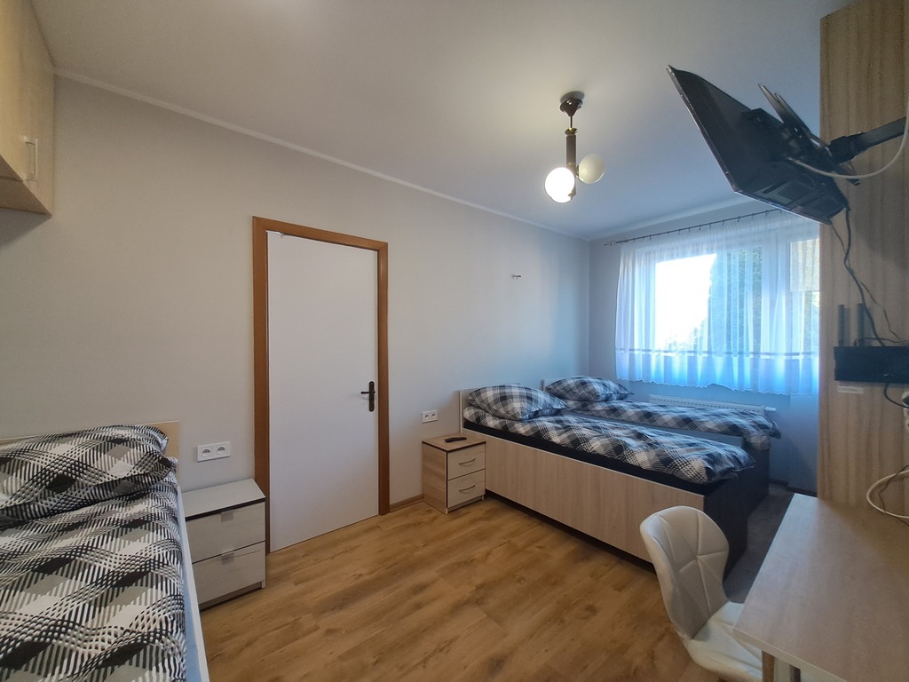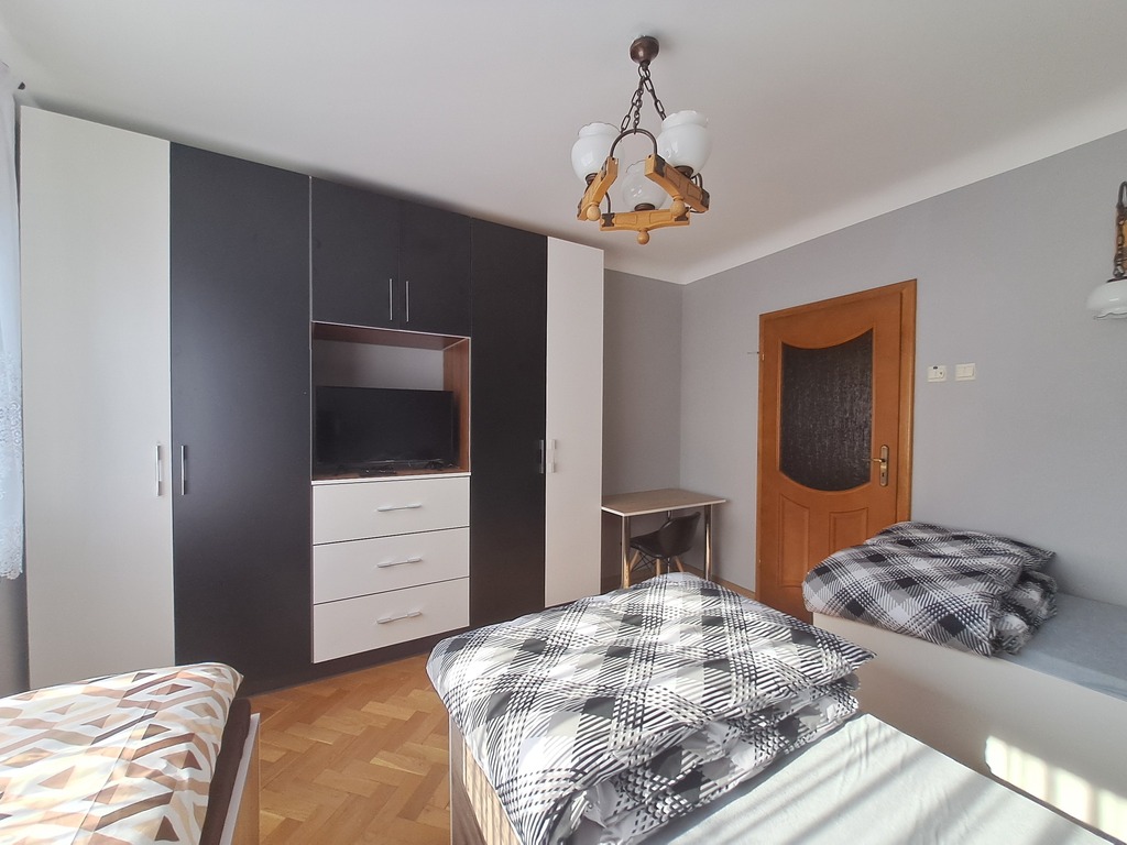 W każdym z 3 pokoi mamy po 3 łóżka, szafę pod zabudowę , stół lub biurko, szafki i TV.