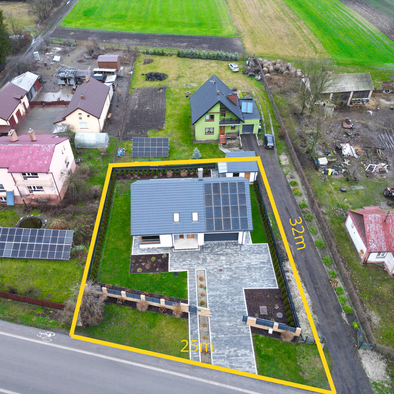 723 m². Prosta, elegancka bryła z dachem dwuspadowym oraz wysokiej jakości wykończenie sprawiają, że nieruchomość jest gotowa do zamieszkania od razu po zakupie – sprzedawana z pełnym wyposażeniem widocznym na zdjęciach.