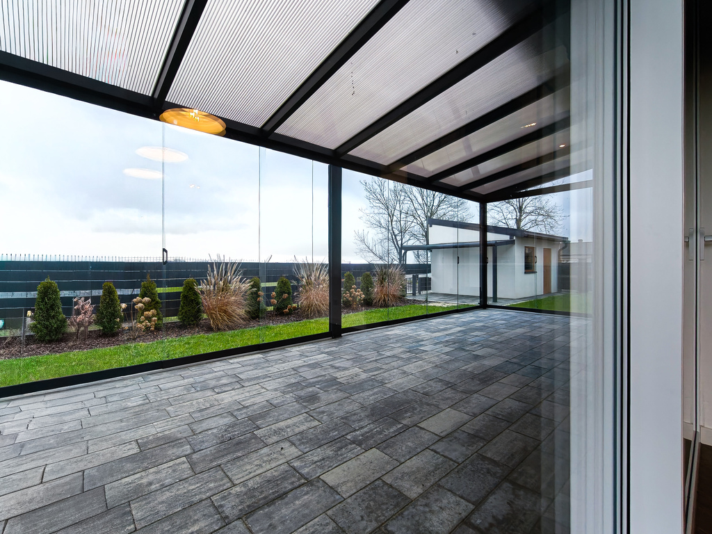 - efektowna strefa tarasowa z przeszklonym ogrodem zimowym