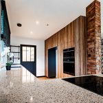 - nowoczesna kuchnia w zabudowie z półwyspem, wysoką zabudową i sprzętem AGD