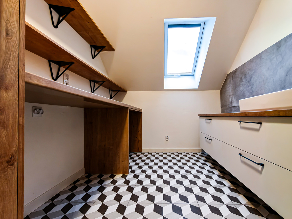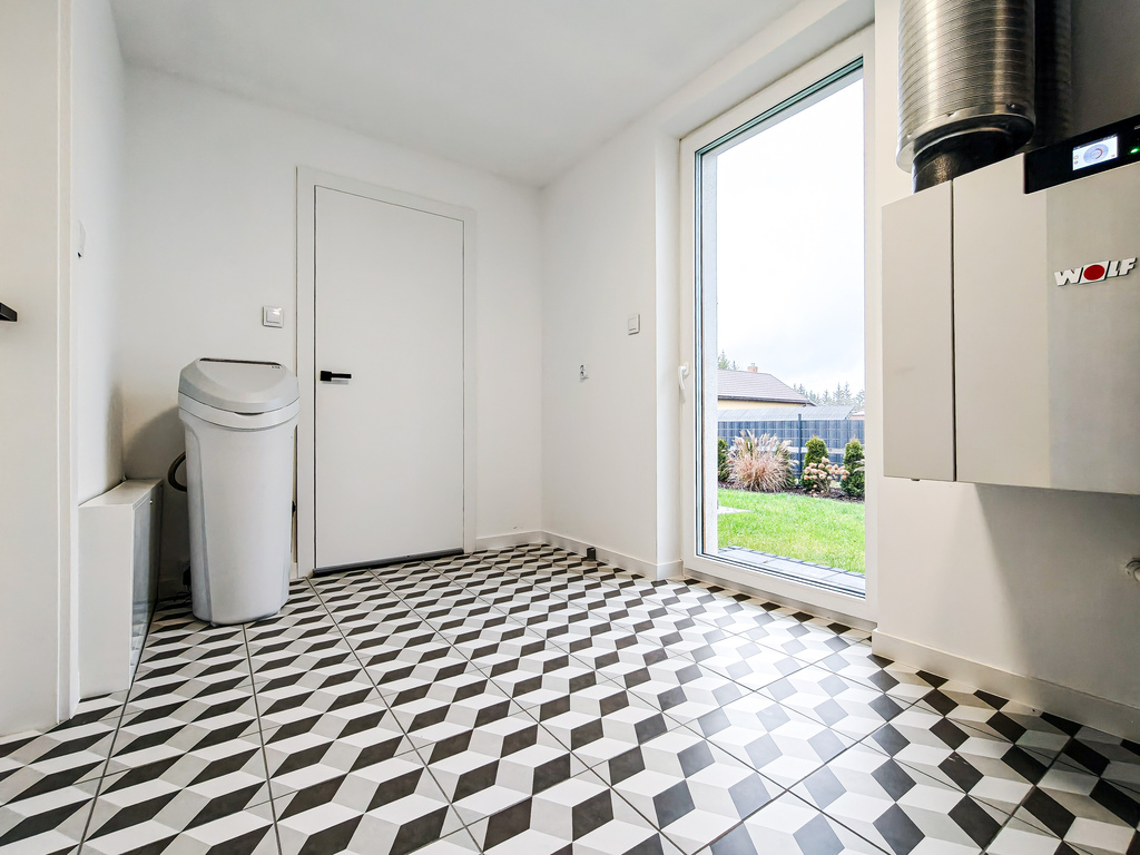 - spiżarnia połączona z zapleczem gospodarczym i garażem