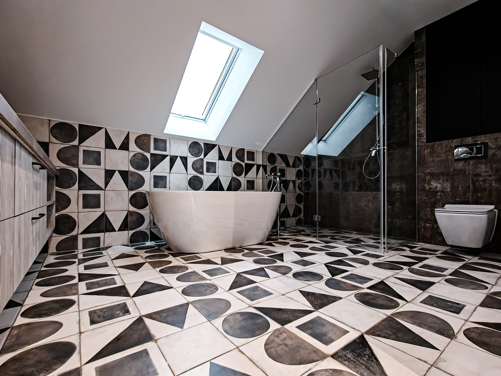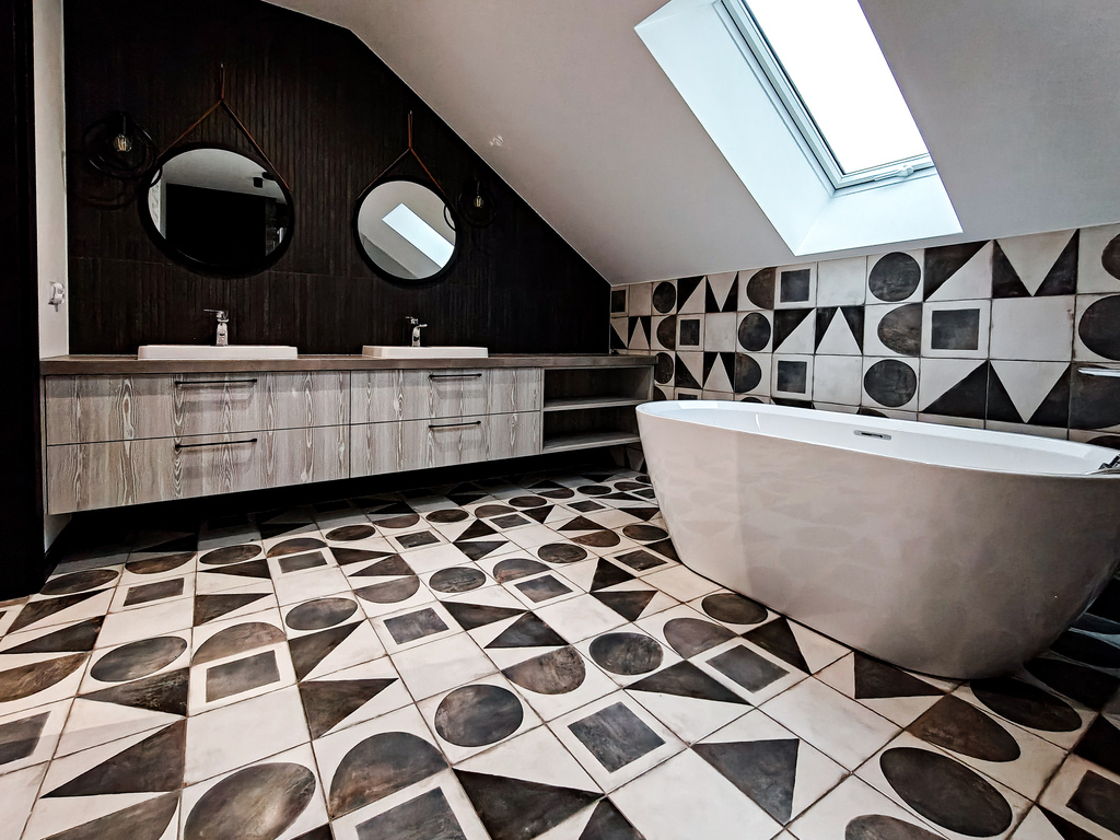 - duża łazienka z wolnostojącą wanną, kabiną prysznicową i nablatowymi umywalkami