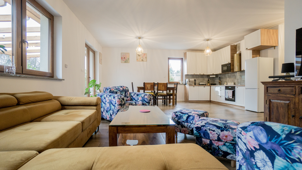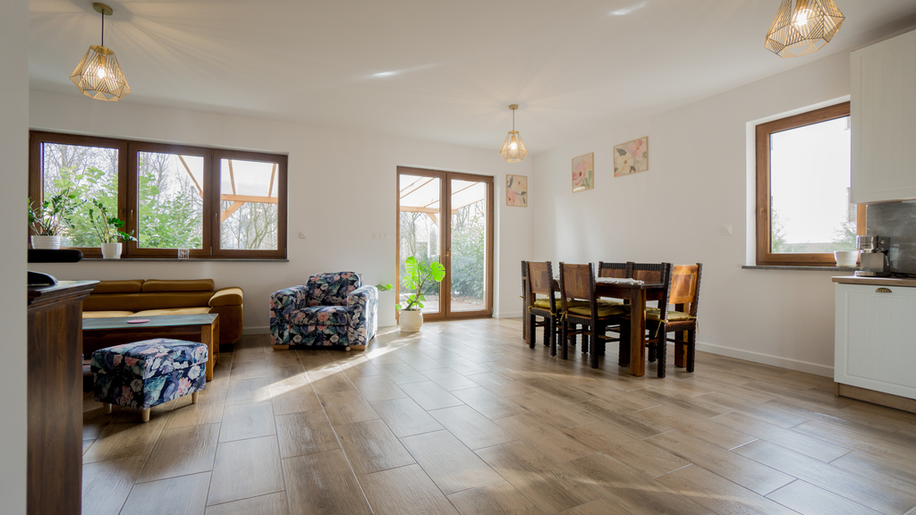 - Salon z aneksem i jadalnią (duży z wyjściem na ogród)