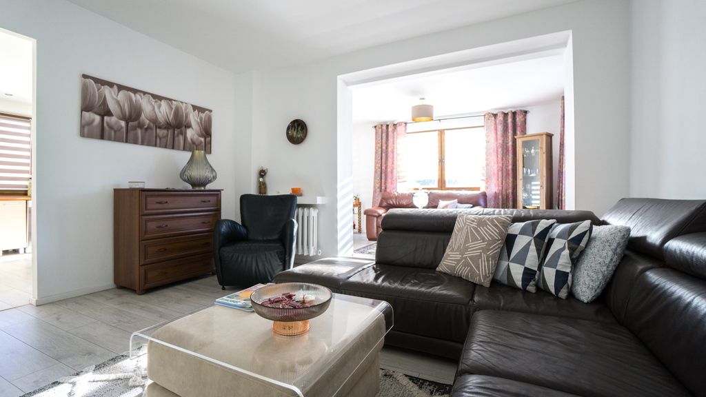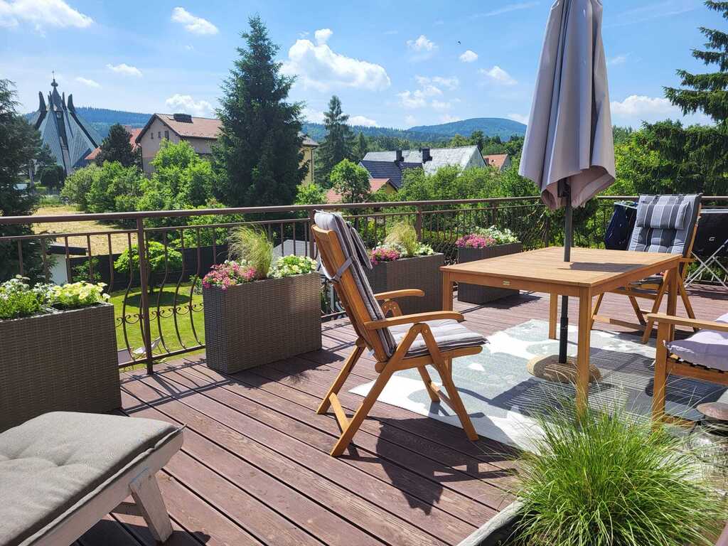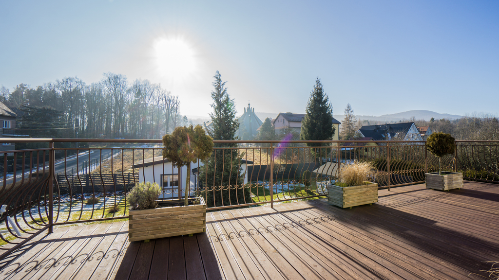 Spokojne sąsiedztwo, zadbane otoczenie, ogród, garaż, duży taras z widokiem na góry.