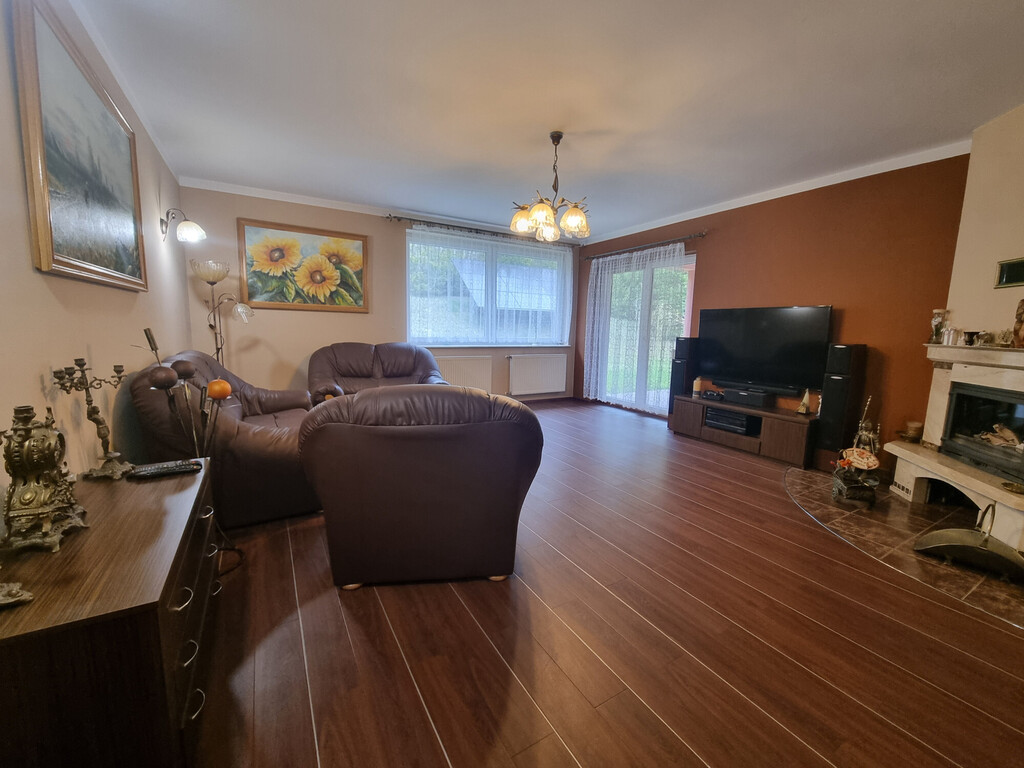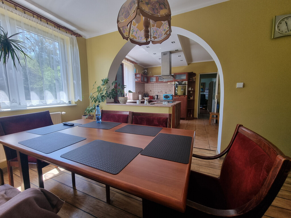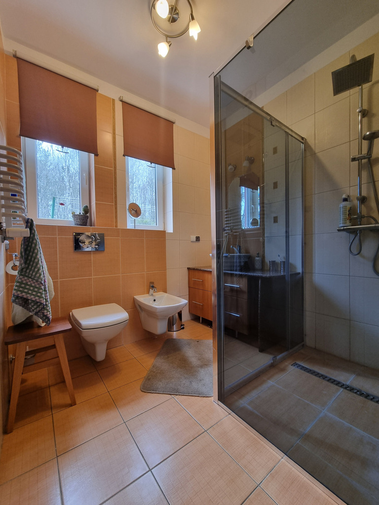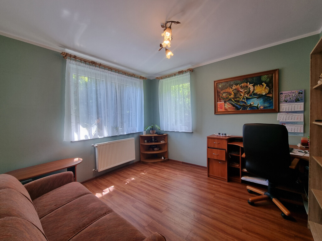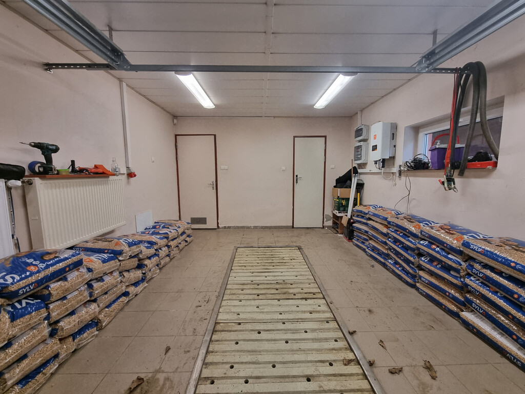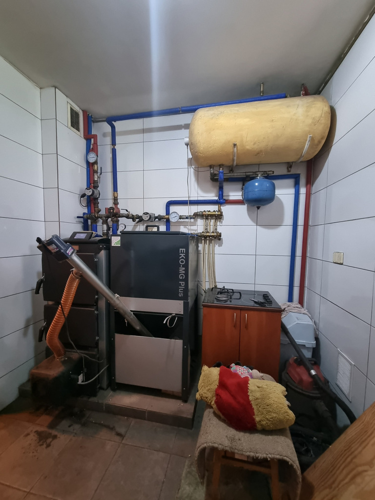 Na poziomie parteru znajduje się również kotłownia z piecem na pelet (piec jest z 2020 roku); spiżarnia; spory GARAŻ (20,62 m2, siła) z kanałem i niewielkie pomieszczenie warsztatu, a także wiata o konstrukcji drewnianej na jedno auto.