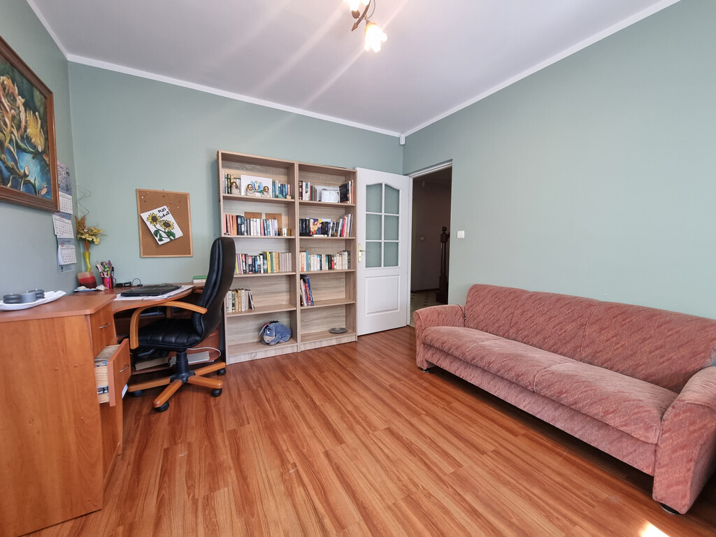 wiatrołap, hol, jasna i zamykana KUCHNIA (11,20 m2) połączona z równie jasną JADALNIĄ (15 m2); GABINET/SYPIALNIA (11,10 m2); wc z oknem (2,10 m2); jasna ŁAZIENKA (4,80 m2, prysznic); przestronna SYPIALNIA (14,30 m2) oraz duży i jasny SALON (27 m2, kominek) z wyjściem na drewniany taras i do ogrodu.