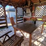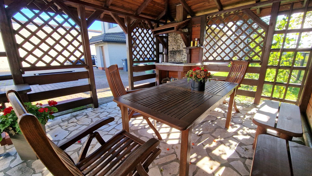 Na działce znajduje się drewniana altana z grillem, która stanowi idealną przestrzeń do rodzinnych spotkań.