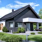 Dach pokryty dachówką ceramiczną, okna w kolorze antracyt z roletami zewnętrznymi.