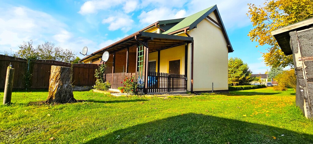 2008 roku z pustaka szarego (1,5 pustaka z ociepleniem o grubości 10 cm). Dach pokryty jest papą oraz blachą. Budynek nie jest podpiwniczony, a jego konstrukcja i układ pomieszczeń umożliwiają użytkowanie go zarówno jako domu jednorodzinnego, jak i dwurodzinnego – to doskonałe rozwiązanie dla rodzin wielopokoleniowych lub osób planujących zamieszkanie z możliwością wynajmu części domu.