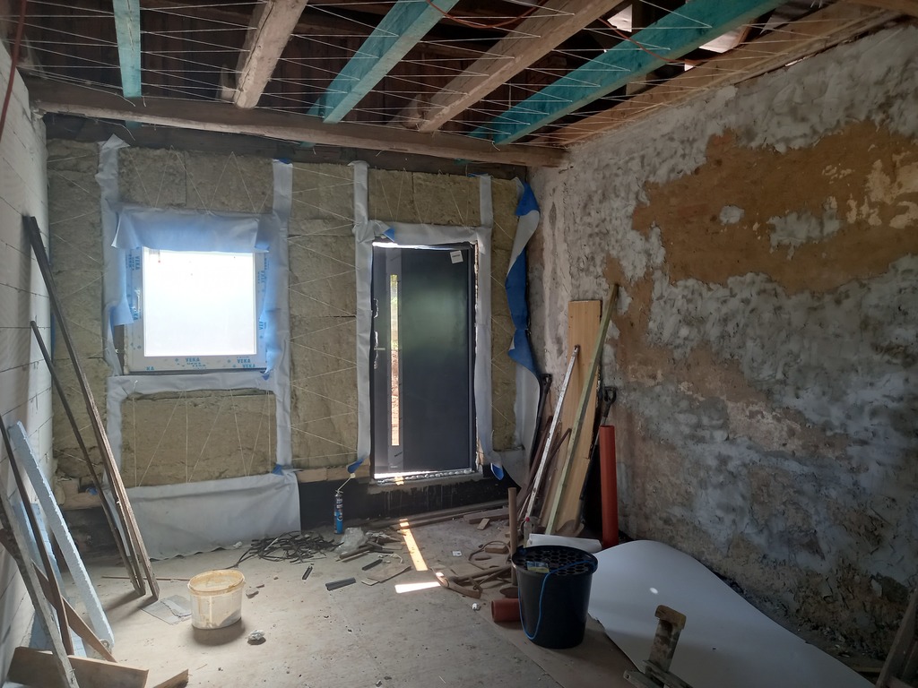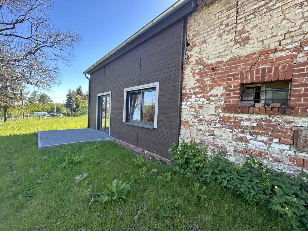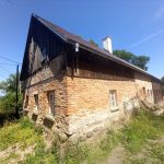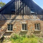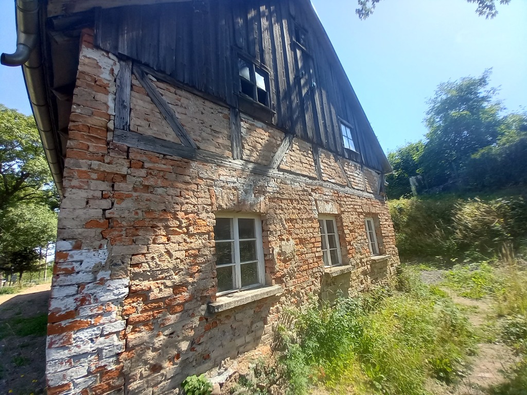 Murowana część domu została oczyszczona ze starych tynków, ma zrobiony dach, sprawdzone drewniane skrzyniowe okna- które idealnie nadają się do renowacji.