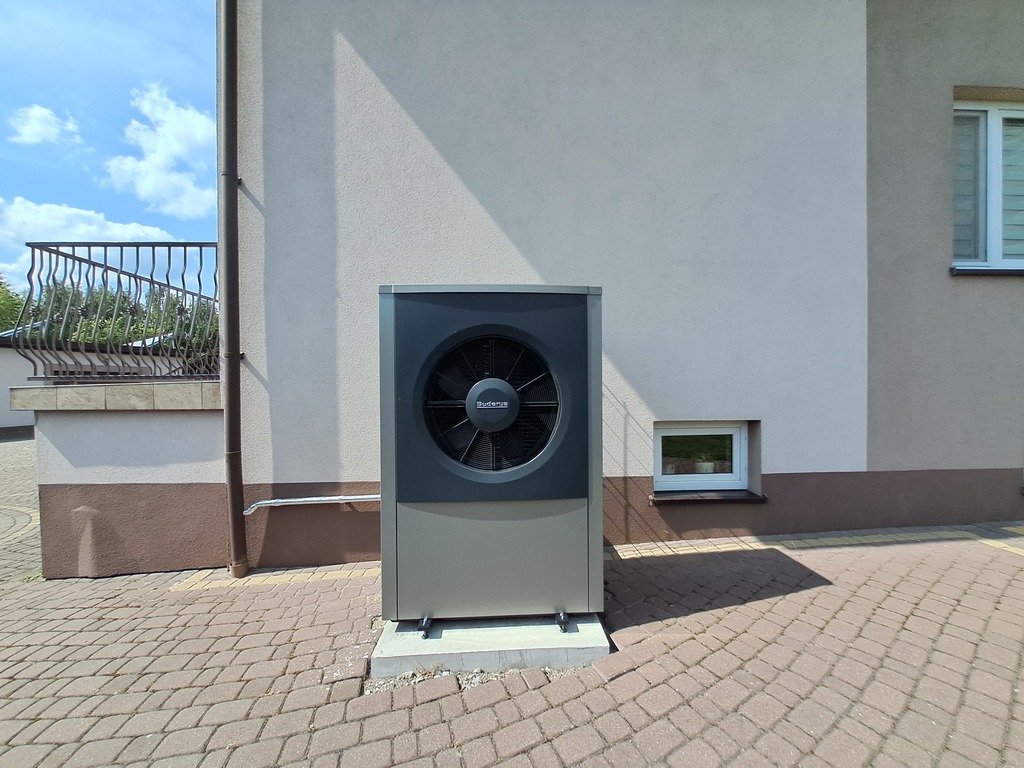 Ogrzewania powietrzną pompą ciepła 14 kW firmy Buderus , dodatkowo piec na eko groszek 5 klasy.