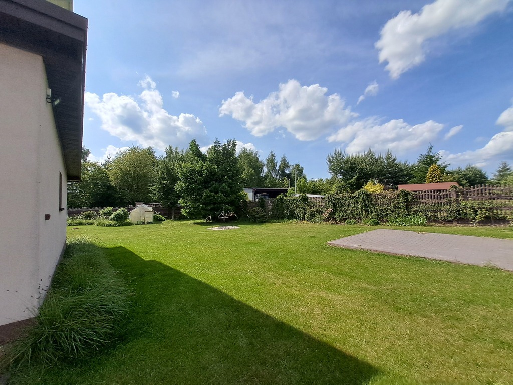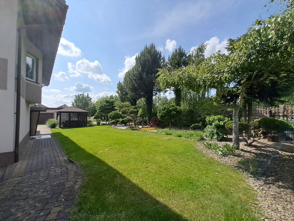 Działka częściowo utwardzona kostką brukową a częściowo porośnięta zadbanym trawnikiem. Zadbany ogród z altanką - idealnym miejscem do letniego wypoczynku, licznymi nasadzeniami drzew i krzewów ozdobnych oraz kwiatów.