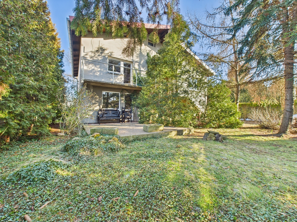 Dom otoczony jest kameralnym ogrodem w stylu leśnym, który zapewnia poczucie prywatności i spokoju. Naturalna zieleń, drzewa i krzewy tworzą przyjemny mikroklimat, dzięki czemu to idealne miejsce do relaksu, porannej kawy na tarasie czy spotkań z bliskimi. To przestrzeń, w której można odpocząć od zgiełku miasta.