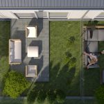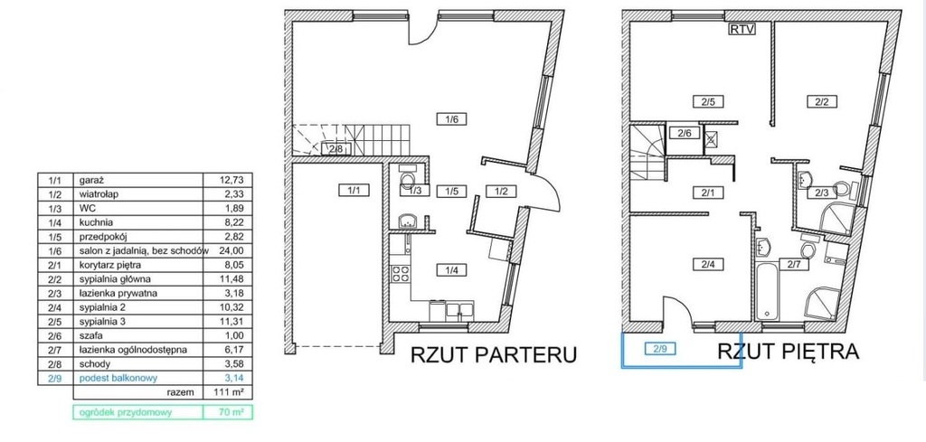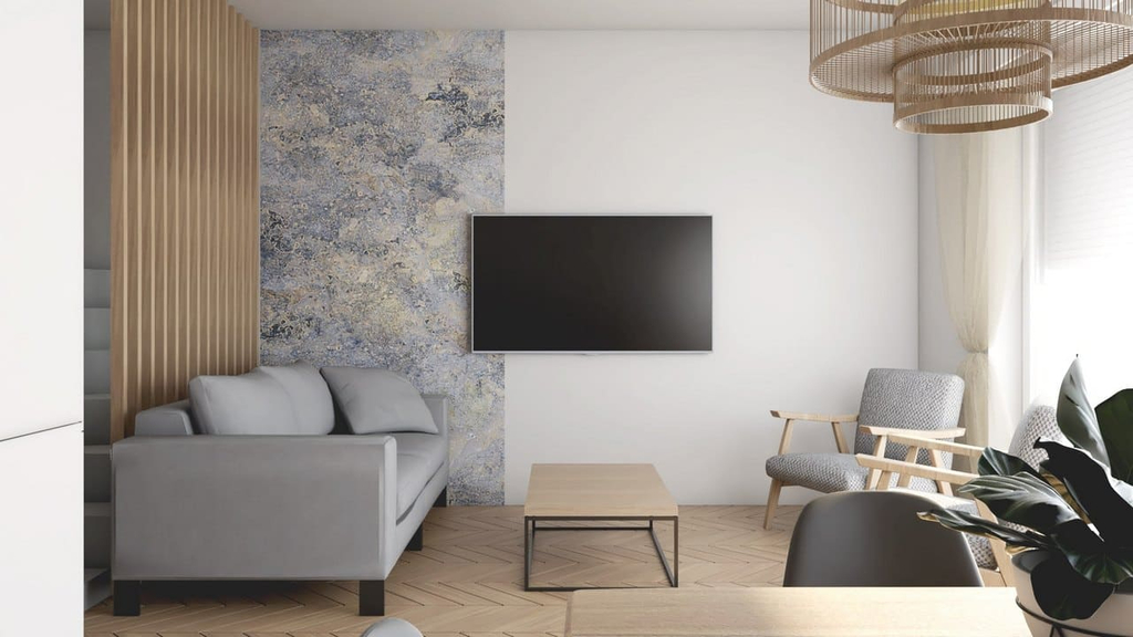 - salonu z aneksem kuchennym i wyjściem do ogródka (26,12 m2)