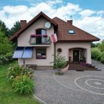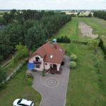 Teren wokół domu został wyłożony kostką, co zapewnia wygodę użytkowania i estetykę.