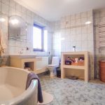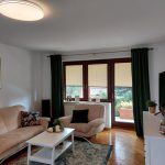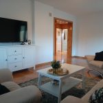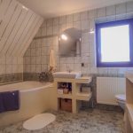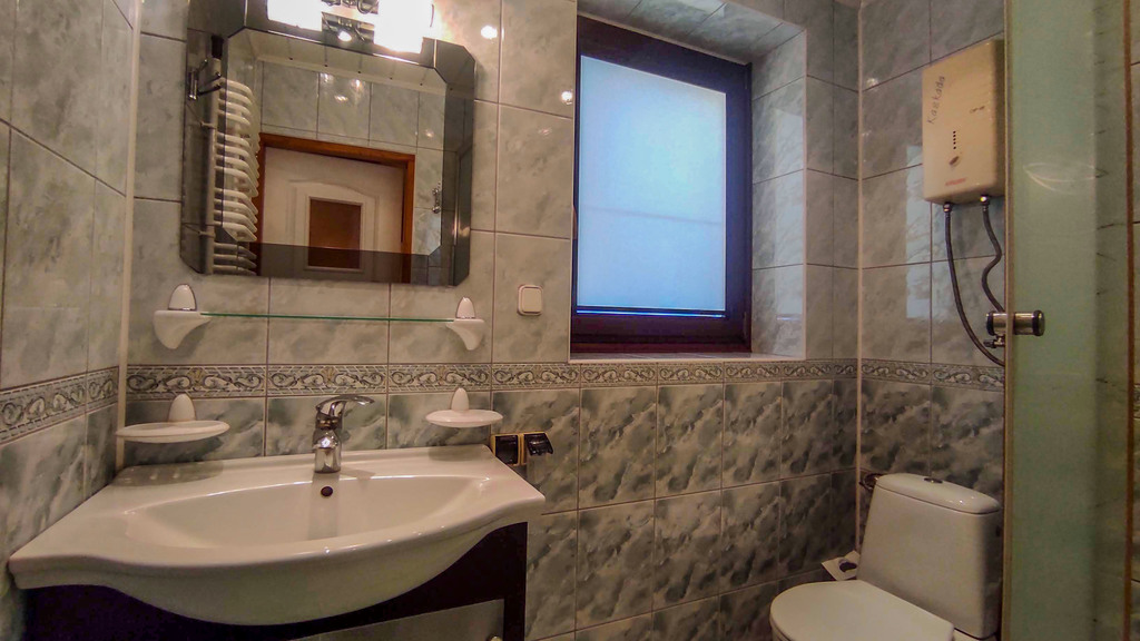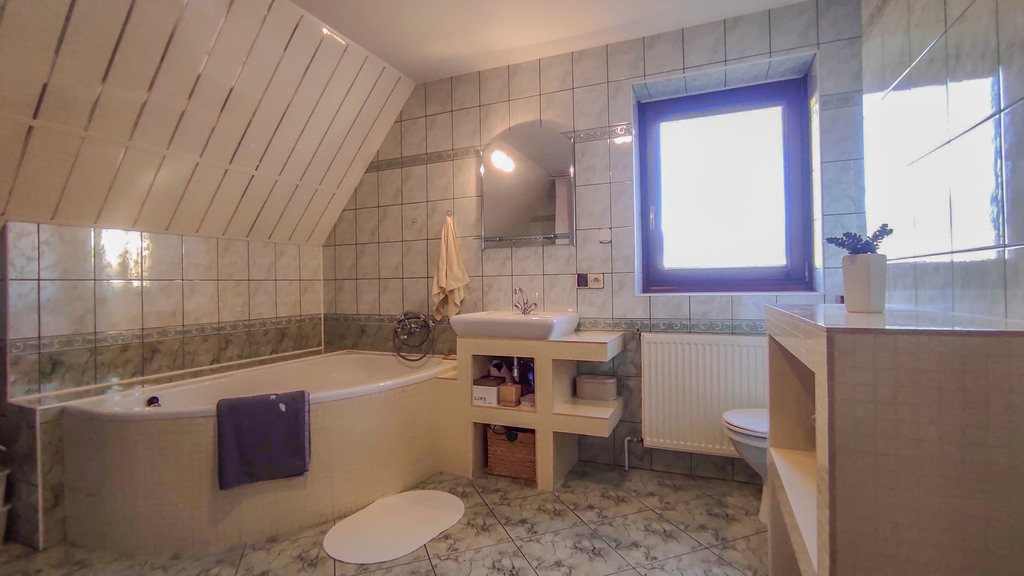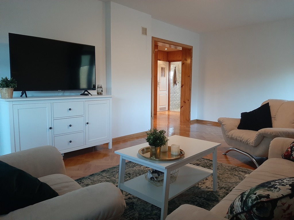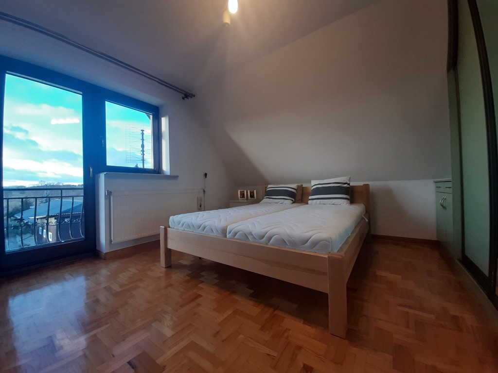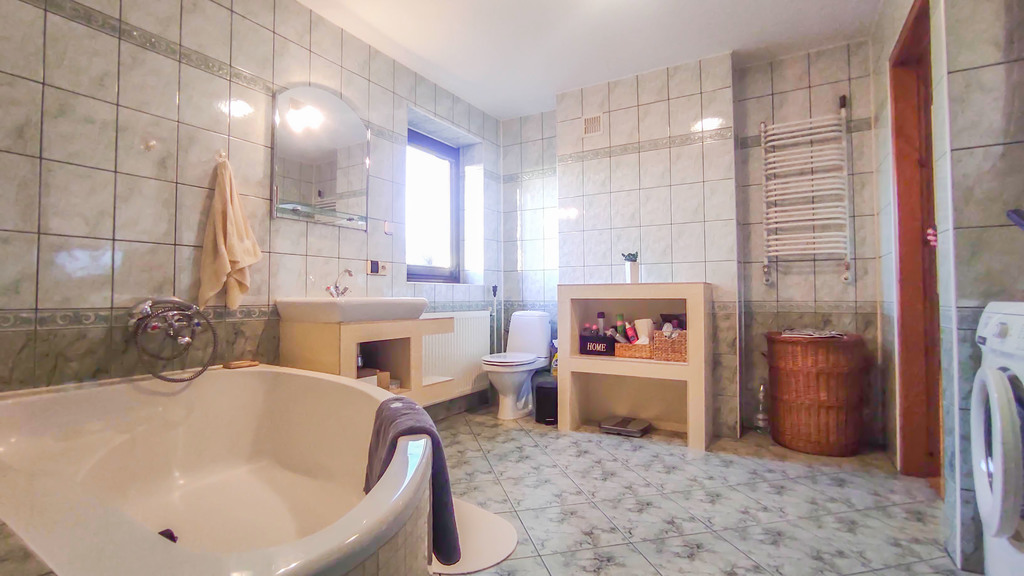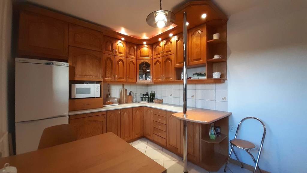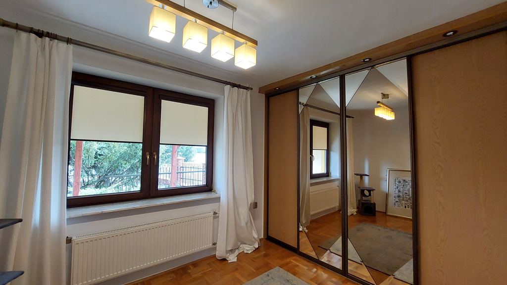 Posiada pięć pokoi, kuchnię i dwie łazienki.