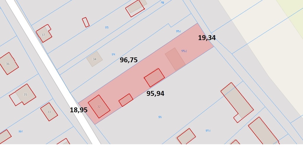 Działka jest ogrodzona o wymiarach ok. 19m szerokości x ok. 96m długości.