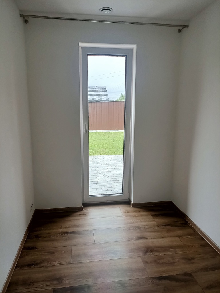 Salon bardzo jasny za sprawą dużego okna, w słoneczne dni z salonu możemy wyjść na