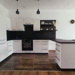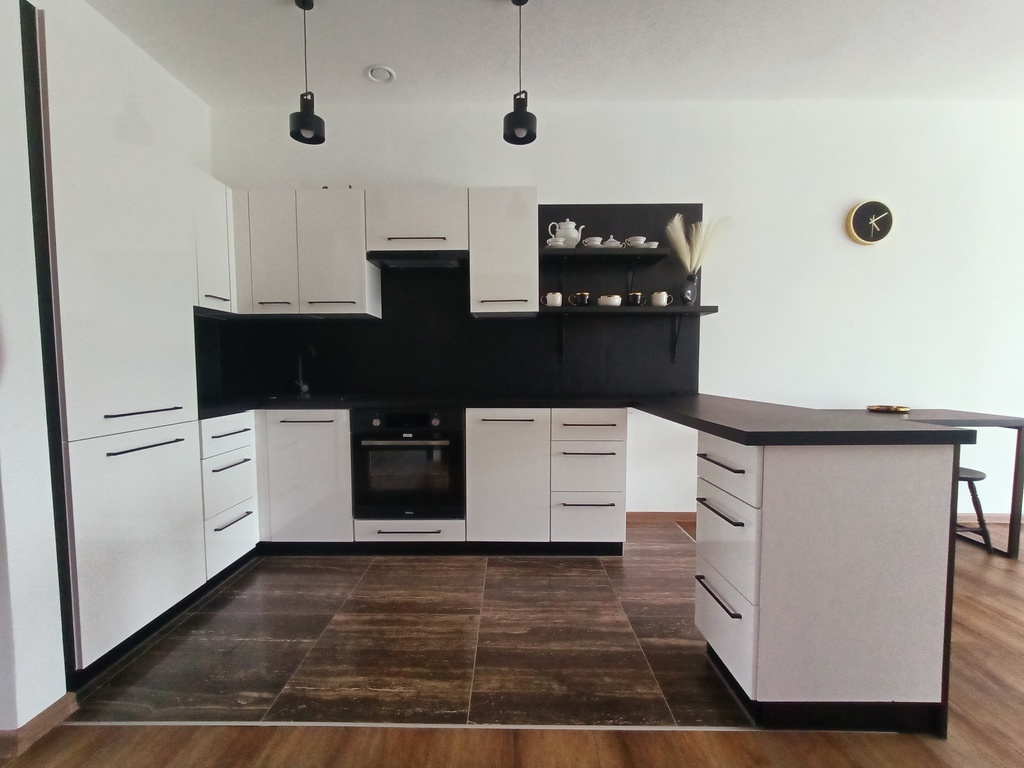Kuchnia w zabudowie (lodówka, zmywarka, indukcja, piekarnik).