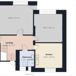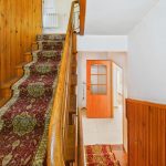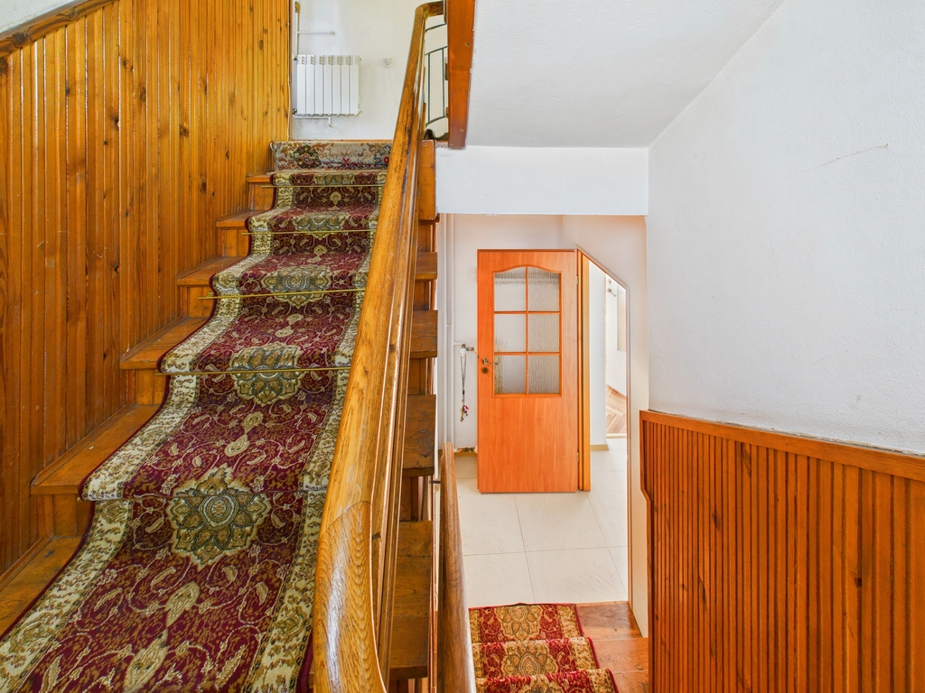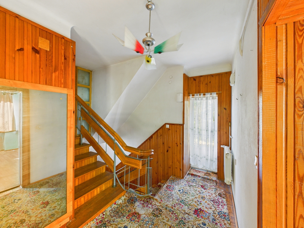Na piętrze są dwa ustawne pokoje , kuchnia ( może być łatwo zamieniona w pokój) , łazienka i duży centralnie przedpokój. Osłoneczniony balkon wychodzi na południe z głównego pokoju podobnie jak na parterze.